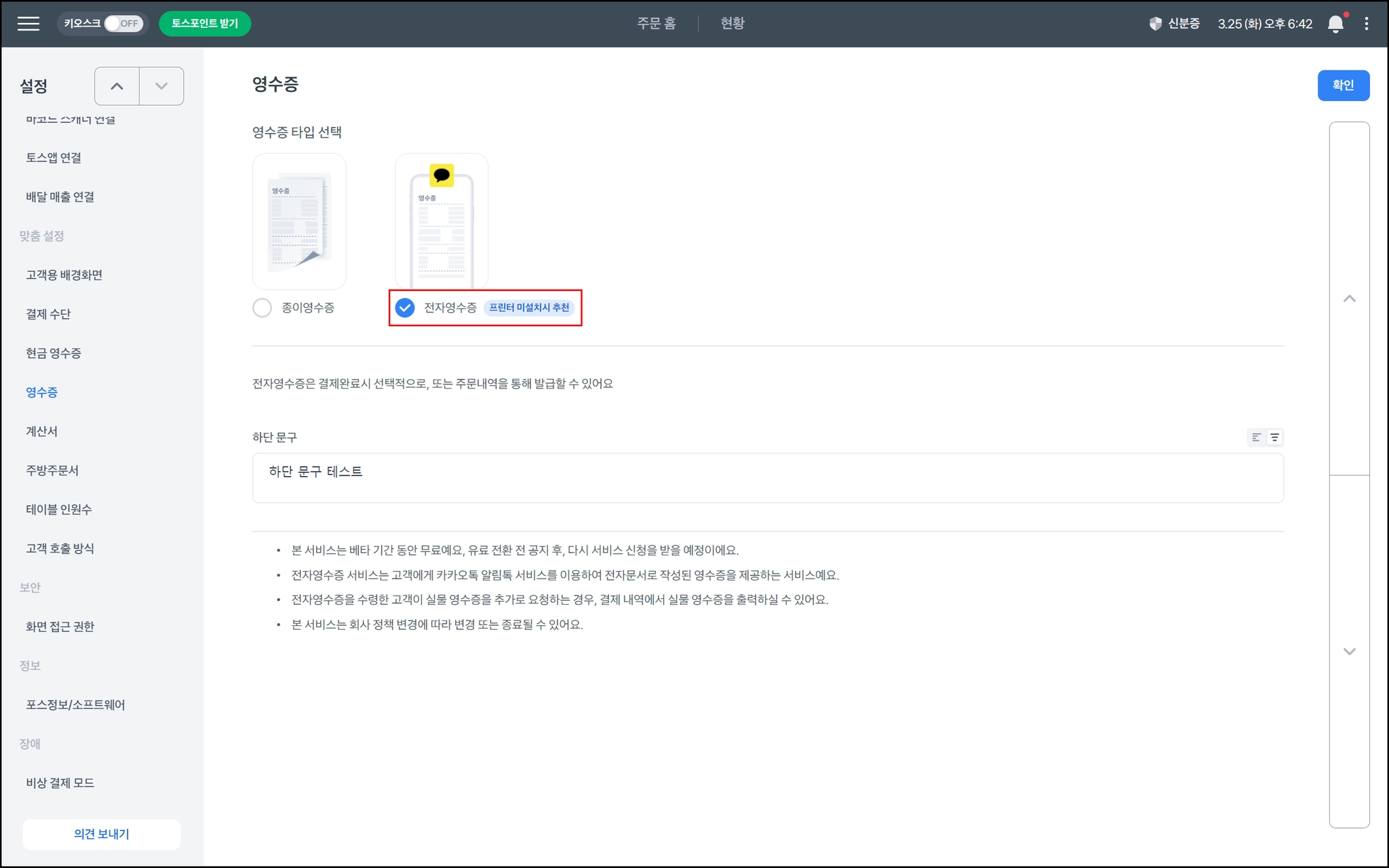 토스포스 왼쪽 상단 ≡ → 설정 → 영수증에서 영수증 타입을 설정할 수 있어요.