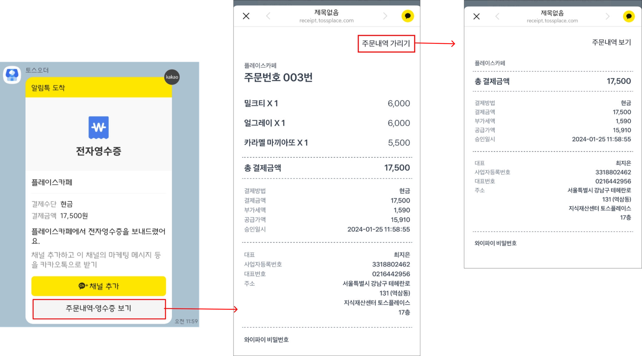 전자영수증을 받으면 주문 메뉴를 보거나, 가려 볼 수 있어요.