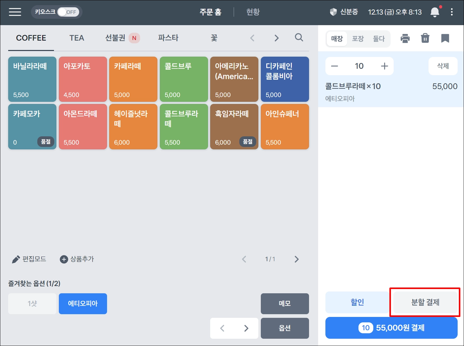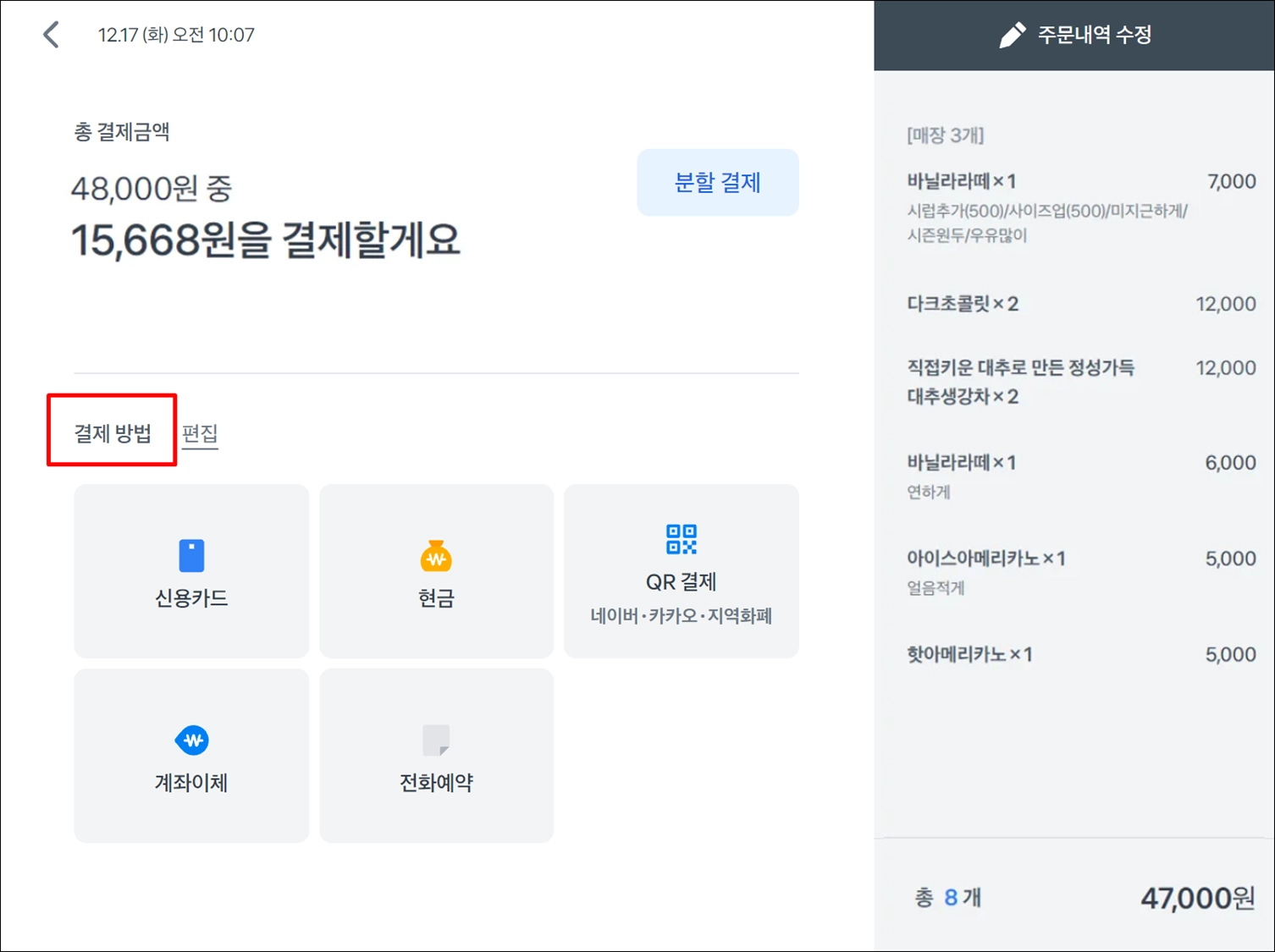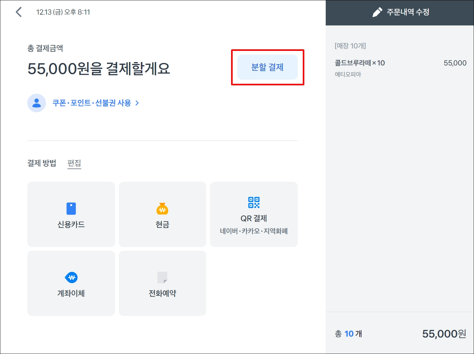 메뉴 선택 후, 분할 결제버튼을 눌러주세요.