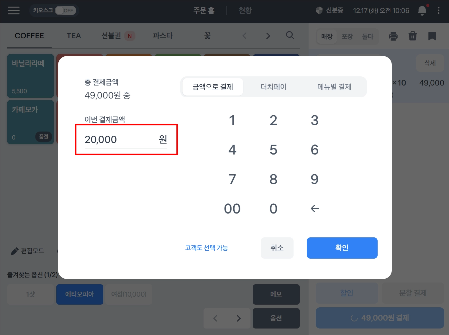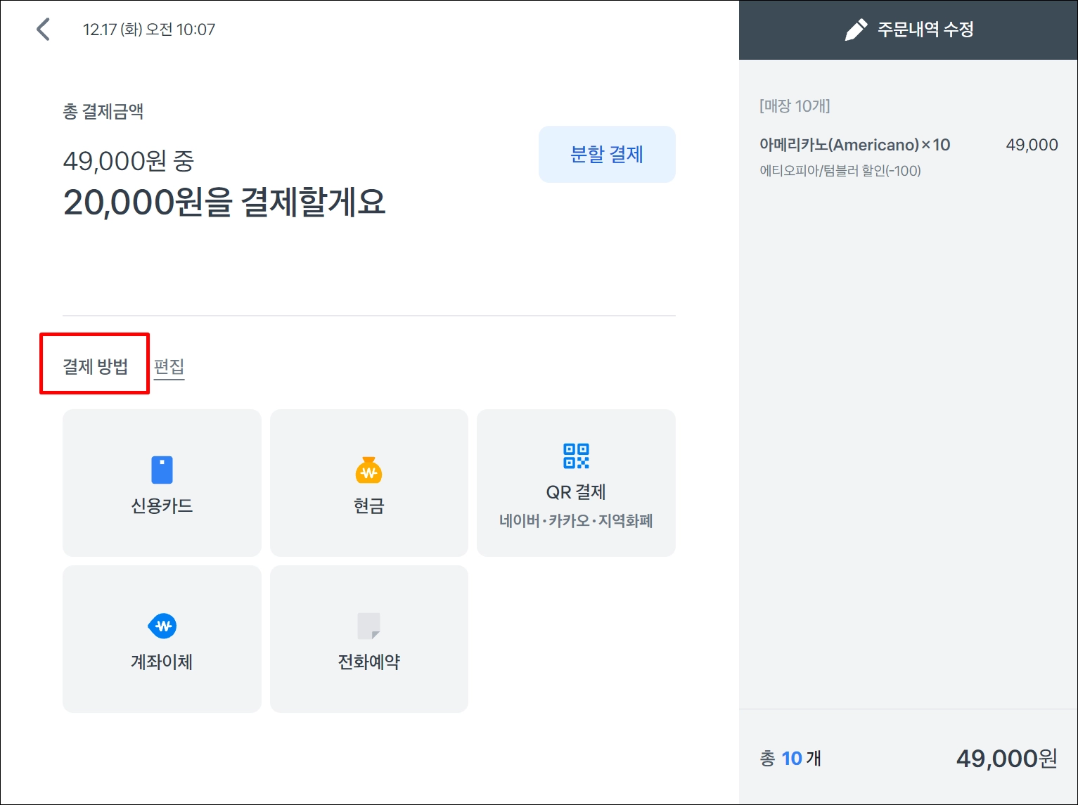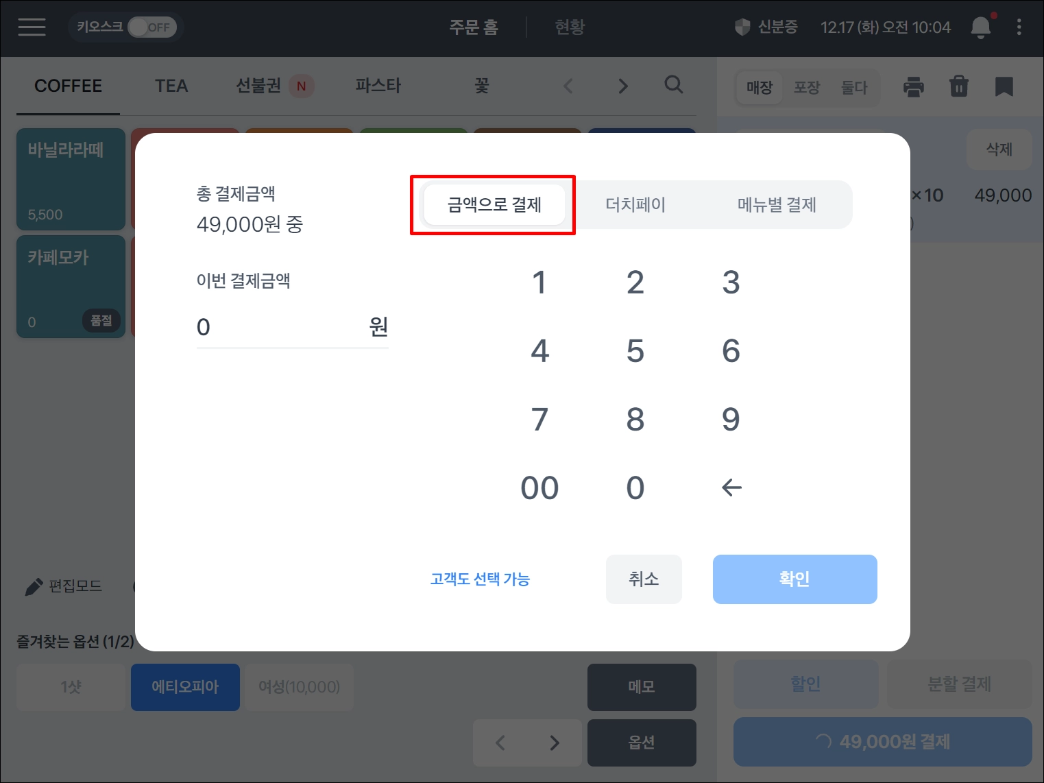 메뉴 선택 후, 분할 결제버튼을 눌러주세요.