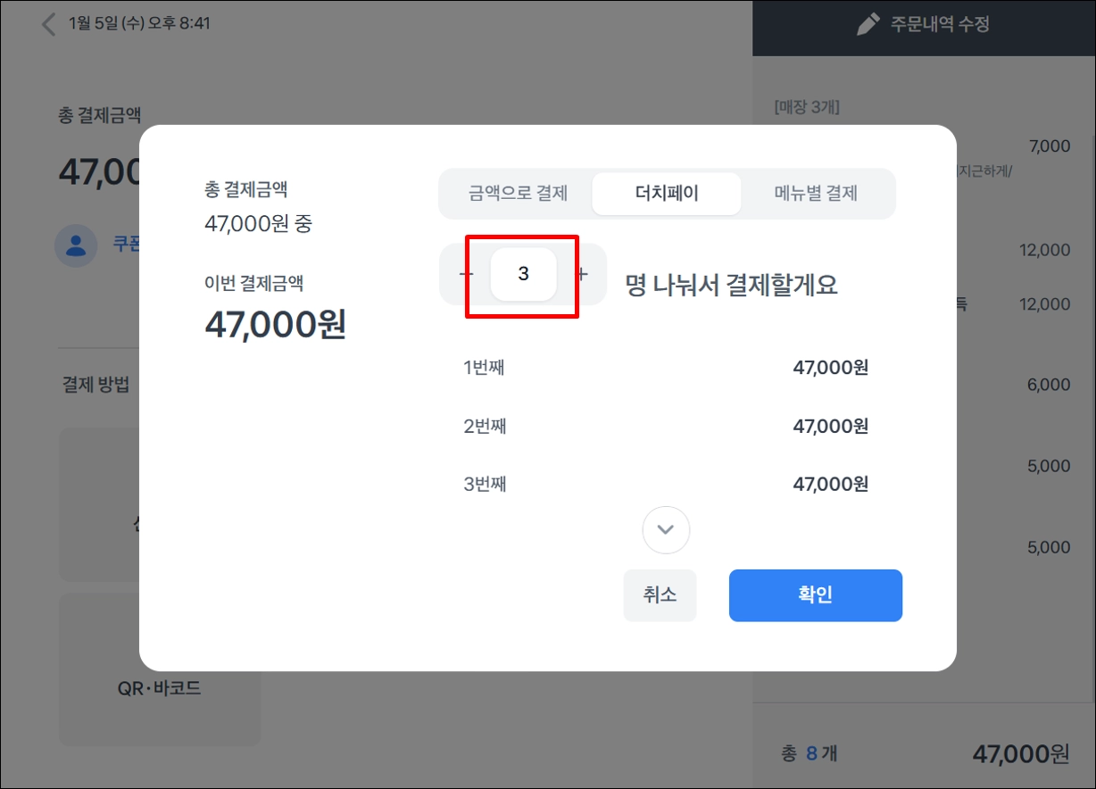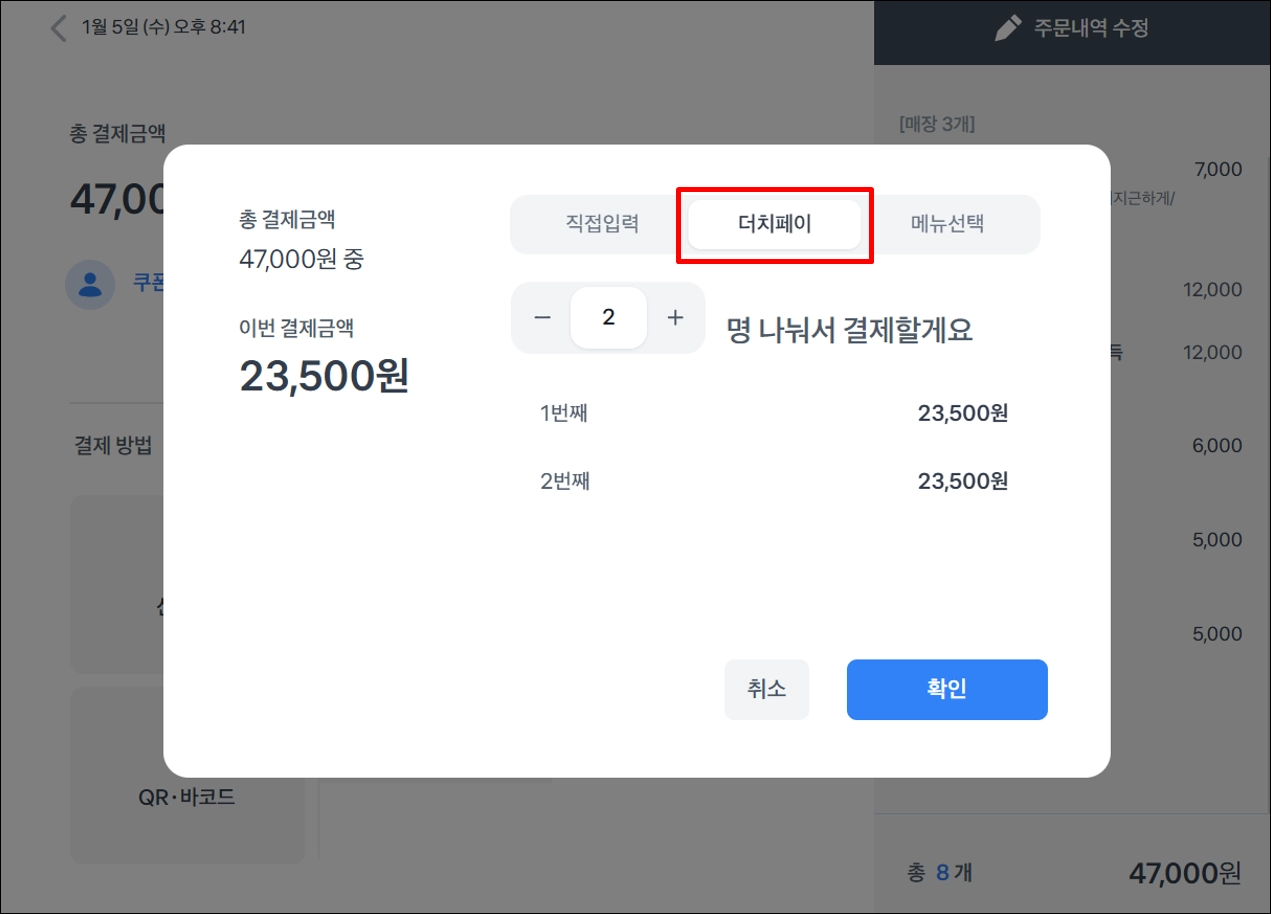 더치페이는 인원 수에 맞춰서 분할 결제를 할 수 있는 기능이에요.