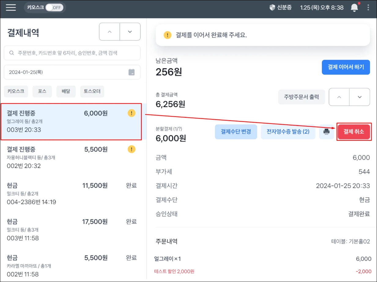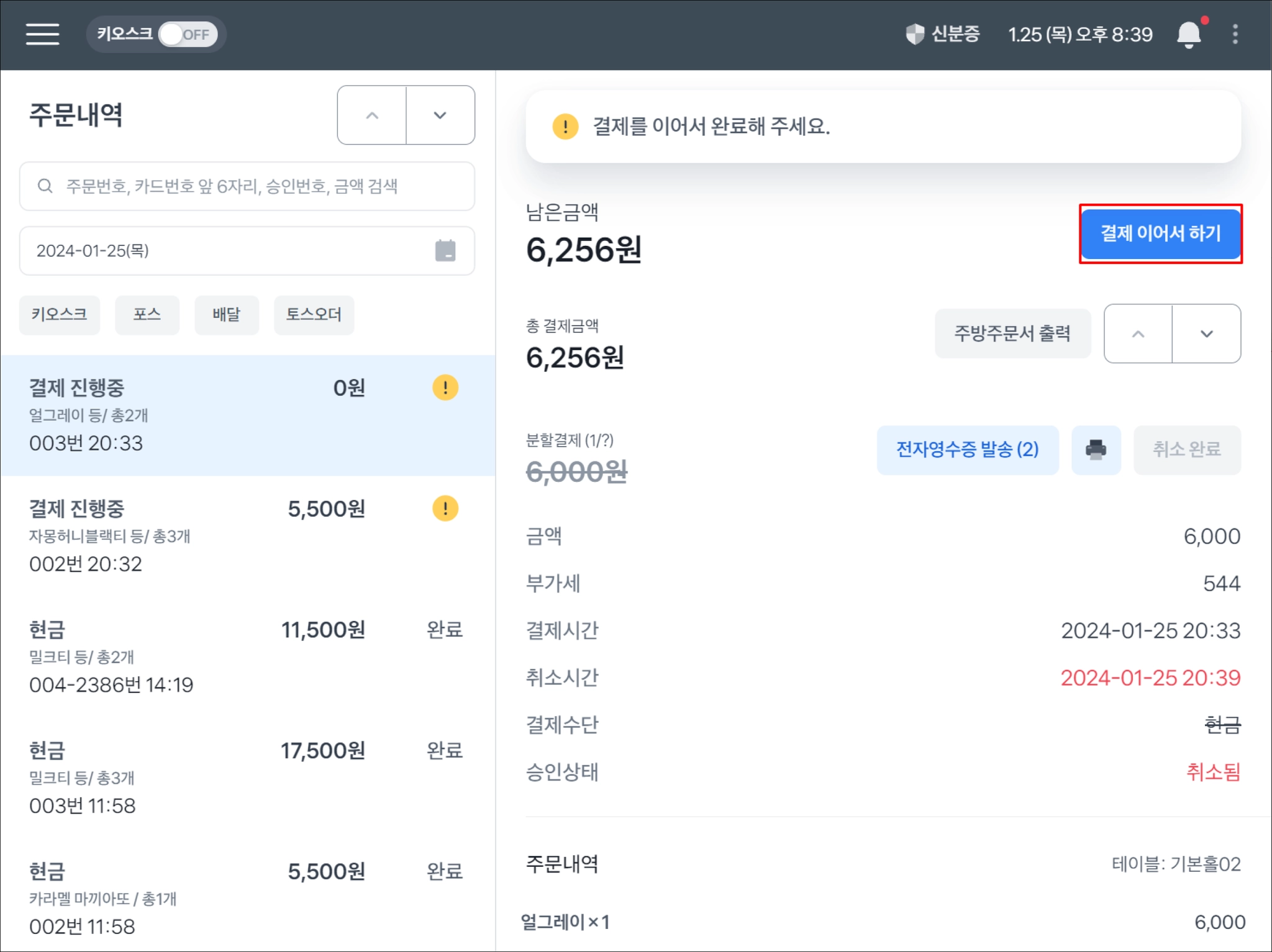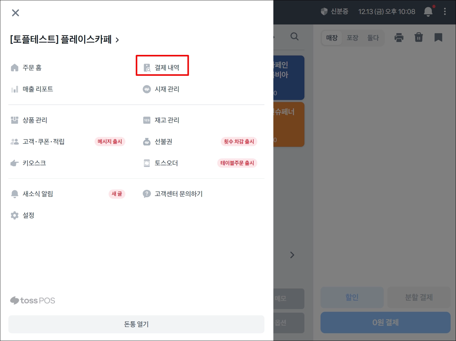 포스 왼쪽 상단 ≡ → 결제 내역을 눌러주세요.