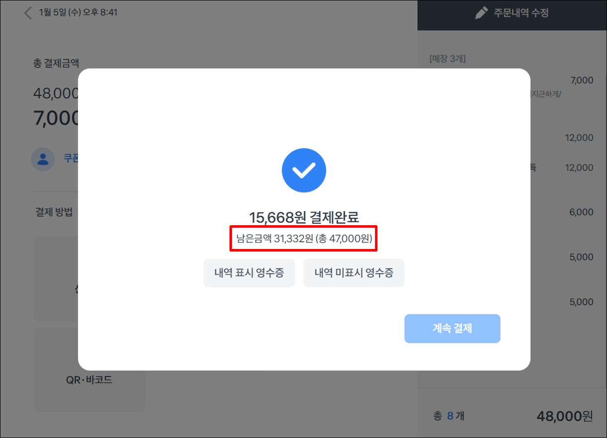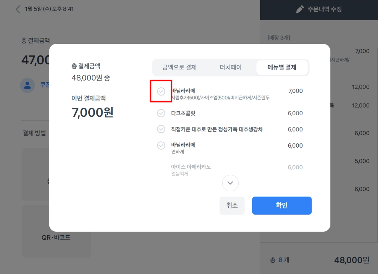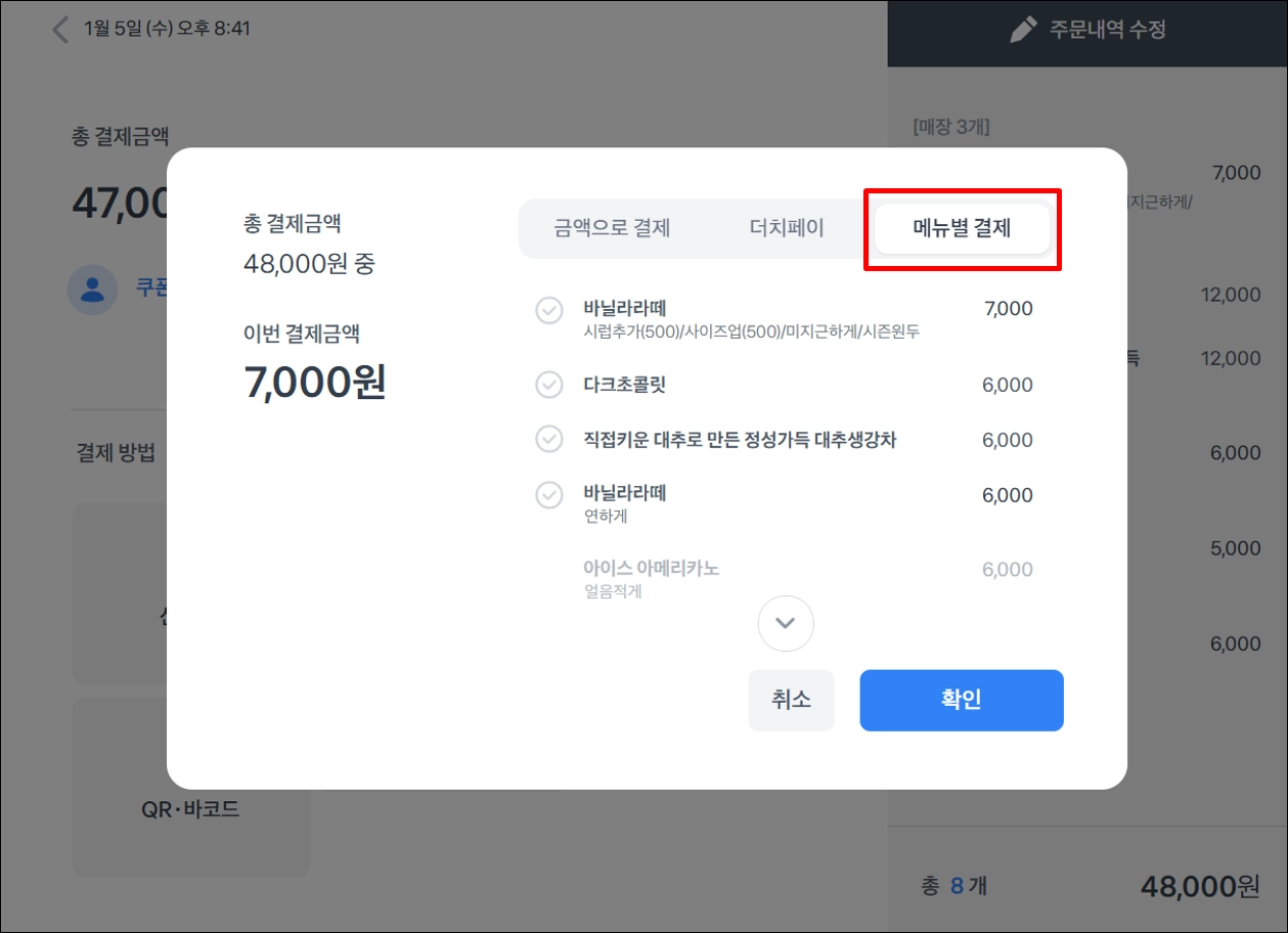 메뉴별 결제는 원하는 메뉴만 선택해서 분할 결제를 할 수 있는 기능이에요.