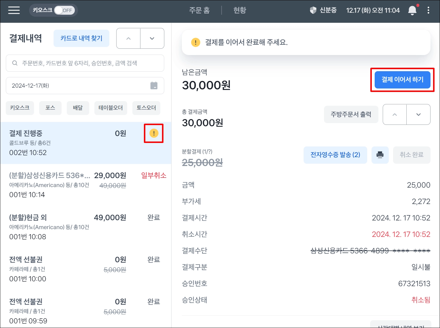 분할 결제 내역 중 일부만 취소 했다면, 결제 내역에 느낌표 아이콘이 보여요.
