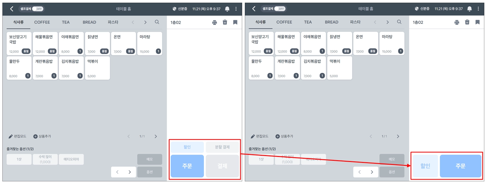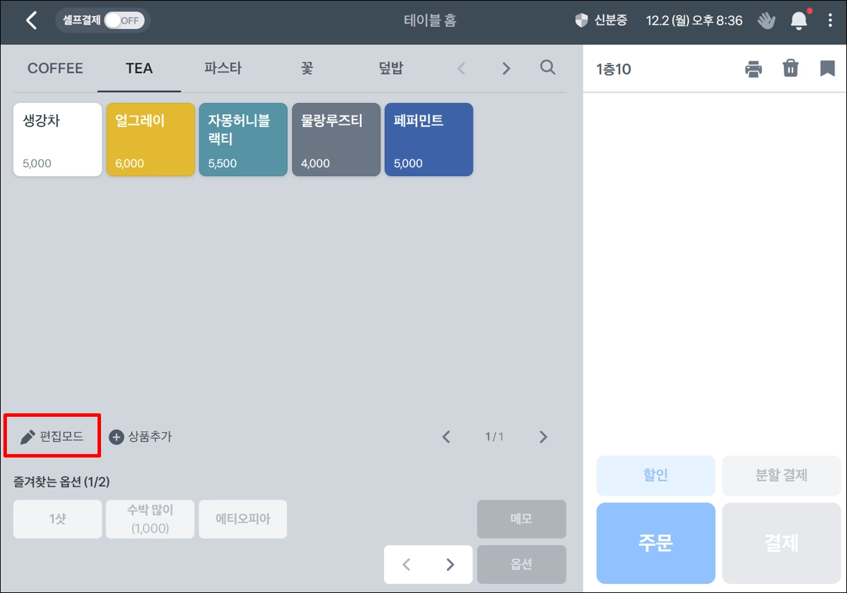 설정을 완료한 후, 메인 화면에 돌아오면 분할결제와 결제버튼이 사라져있는 것을 확인할 수 있어요. 해당 포스를 오더포스로 사용해주세요.
