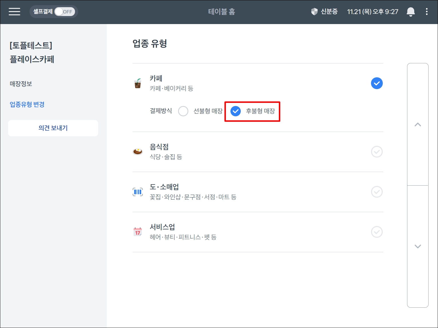 오더포스로 사용할 포스의 왼쪽 상단 ≡ 버튼 → 상단 매장명 클릭 → 업종유형 변경 → 후불형 매장 선택해주세요.
