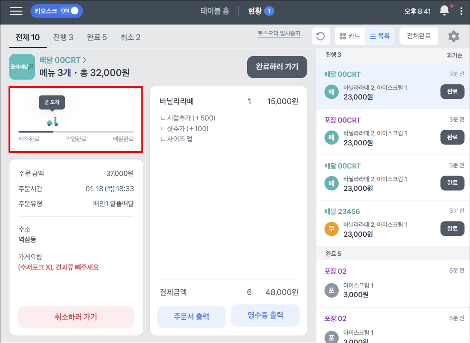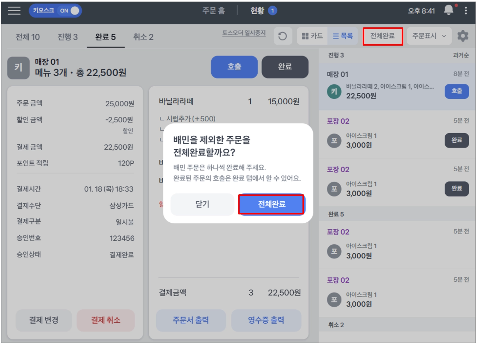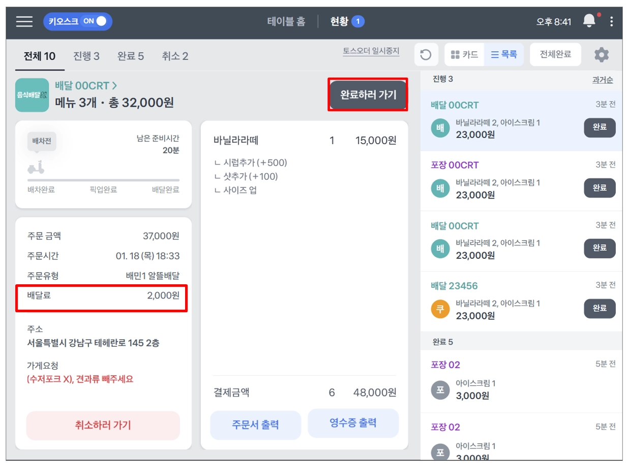 1. 진행중인 주문 중 배민을 제외한 주문은 토스포스 현황에서 전체완료 처리도 가능해요.