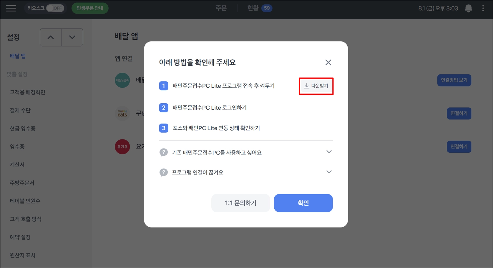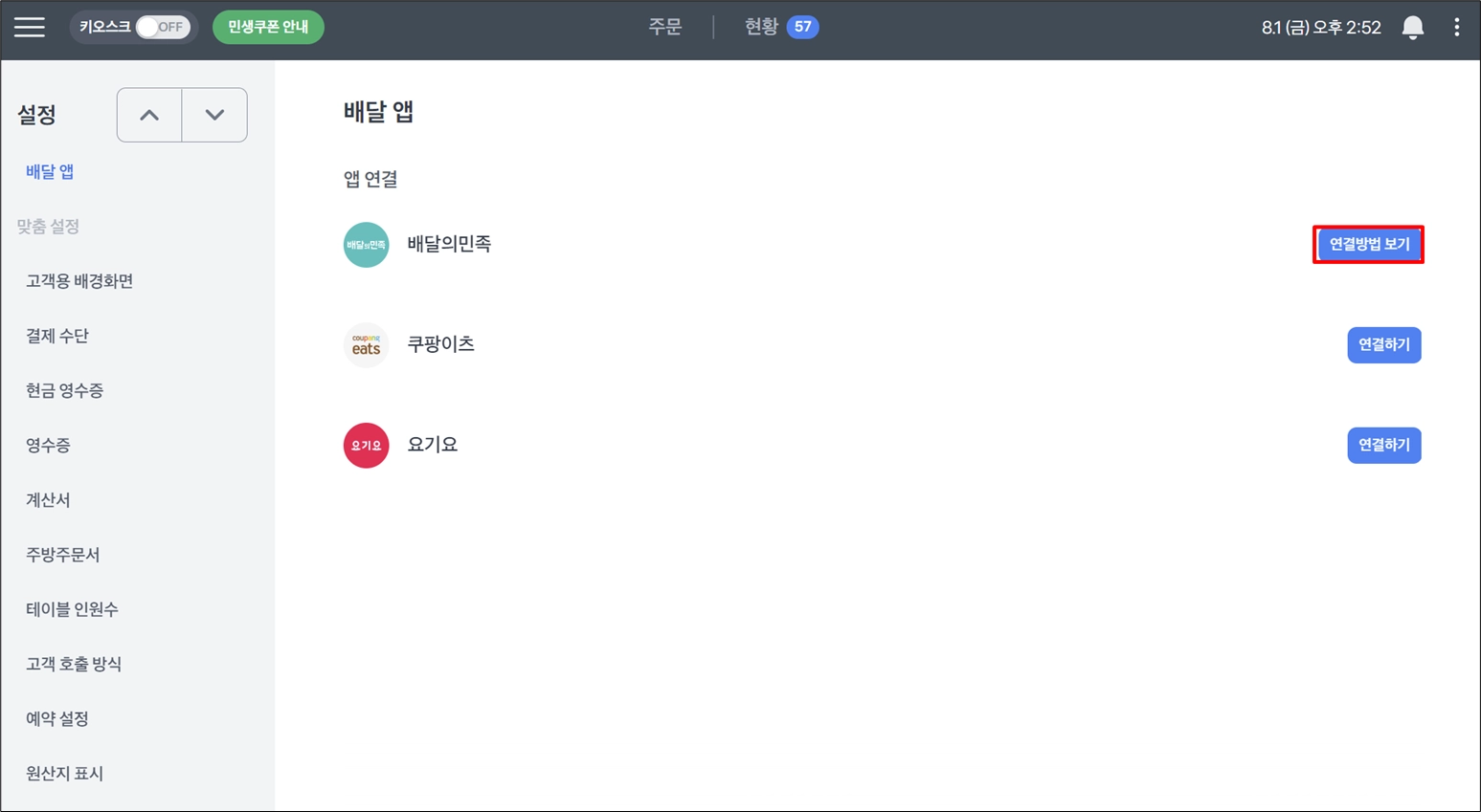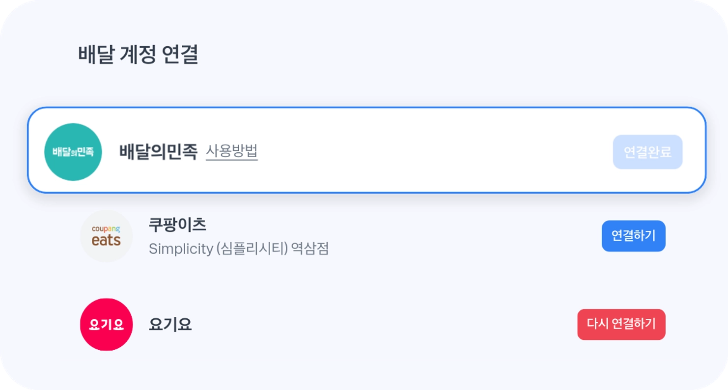 포스 설정 → 배달 계정 연결 → “연결완료” 확인하기