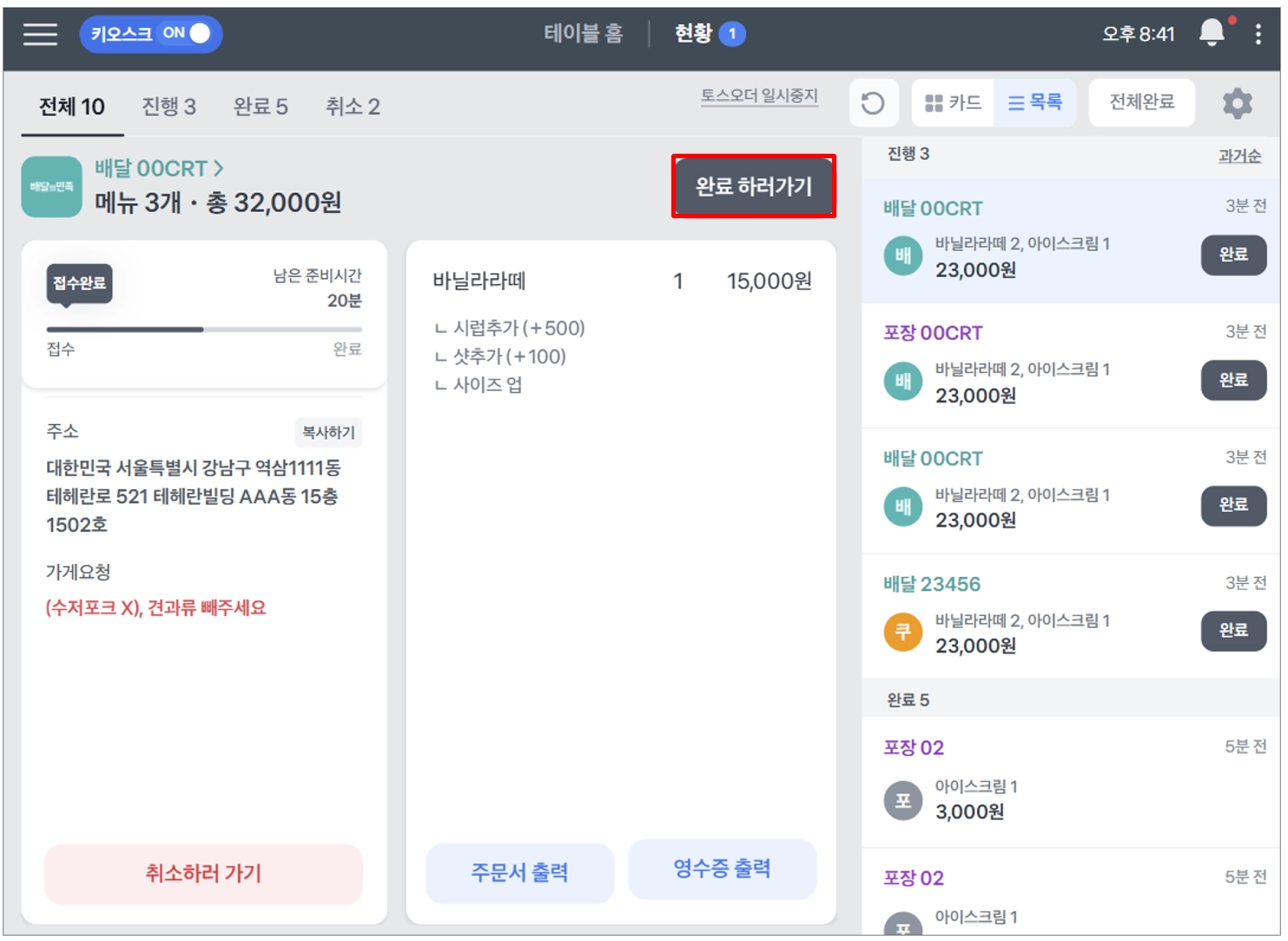 현황에서 진행중인 주문 전체 완료 처리하기