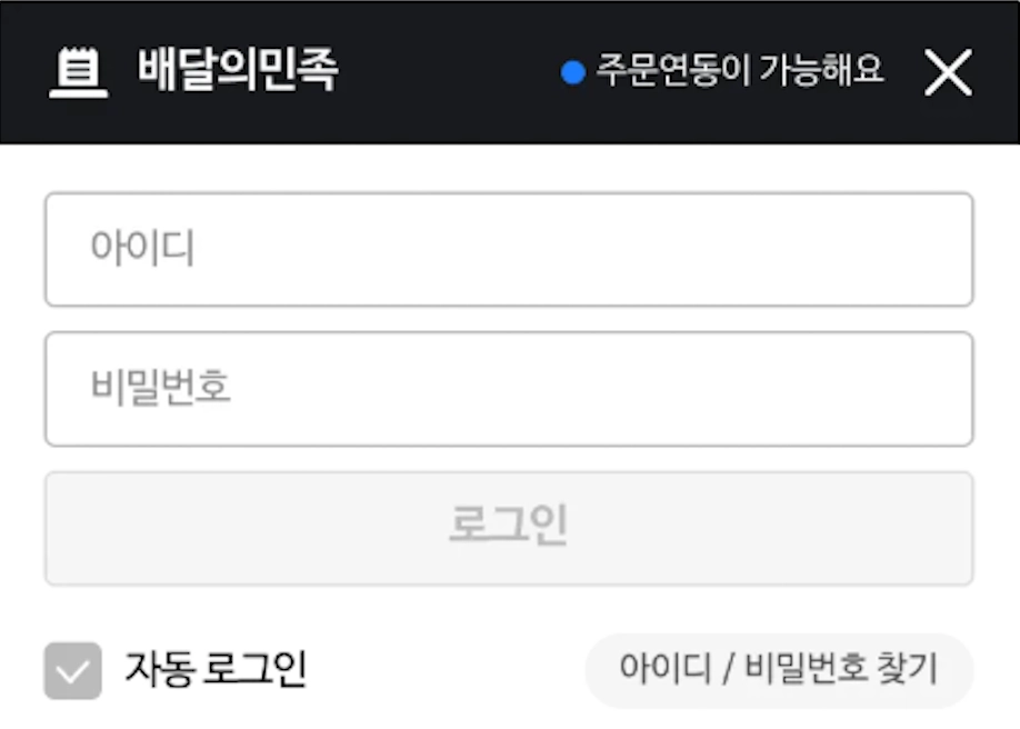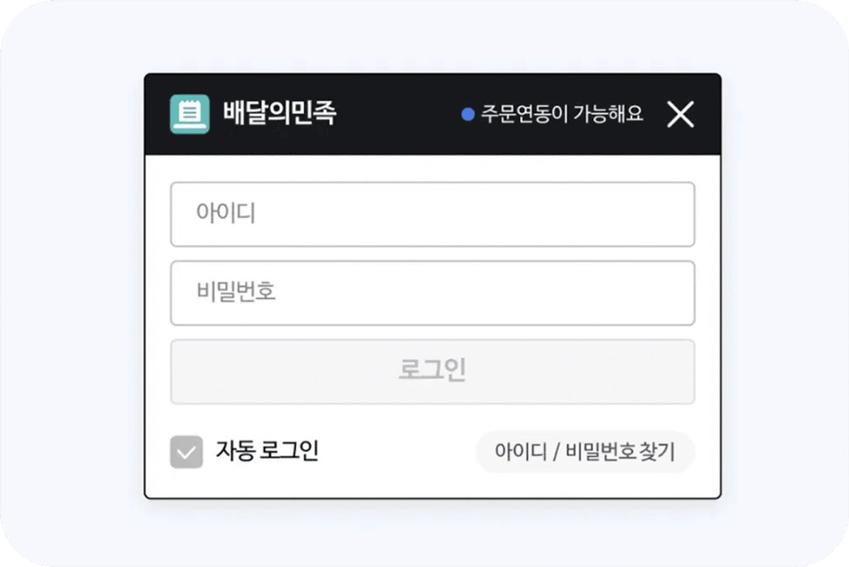 배달의민족 프로그램 로그인 화면에 “주문연동이 가능해요”라고 적혀있어요.