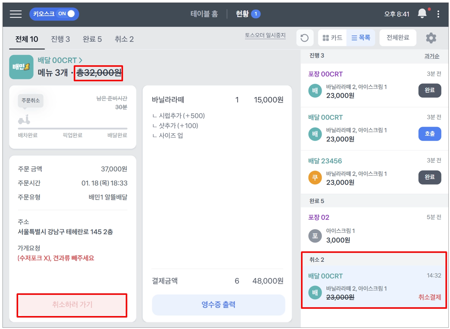 1. 접수완료 후 주문 취소가 필요하면 취소하러 가기 버튼을 선택해요. 2. 취소 후 토스 POS 현황에서 취소 내역을 확인할 수 있어요.