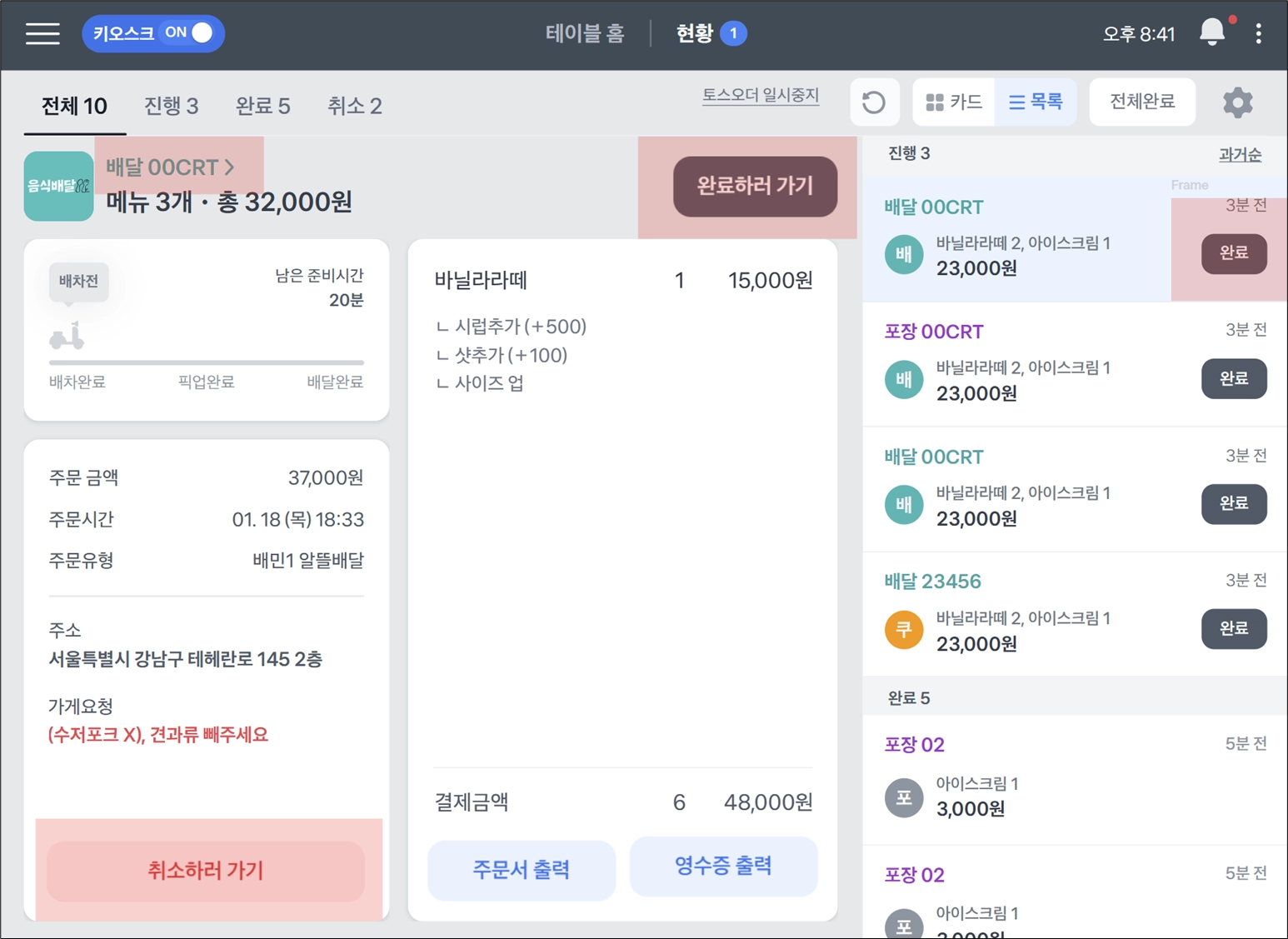 배민 주문은 하나씩 완료해 주세요.