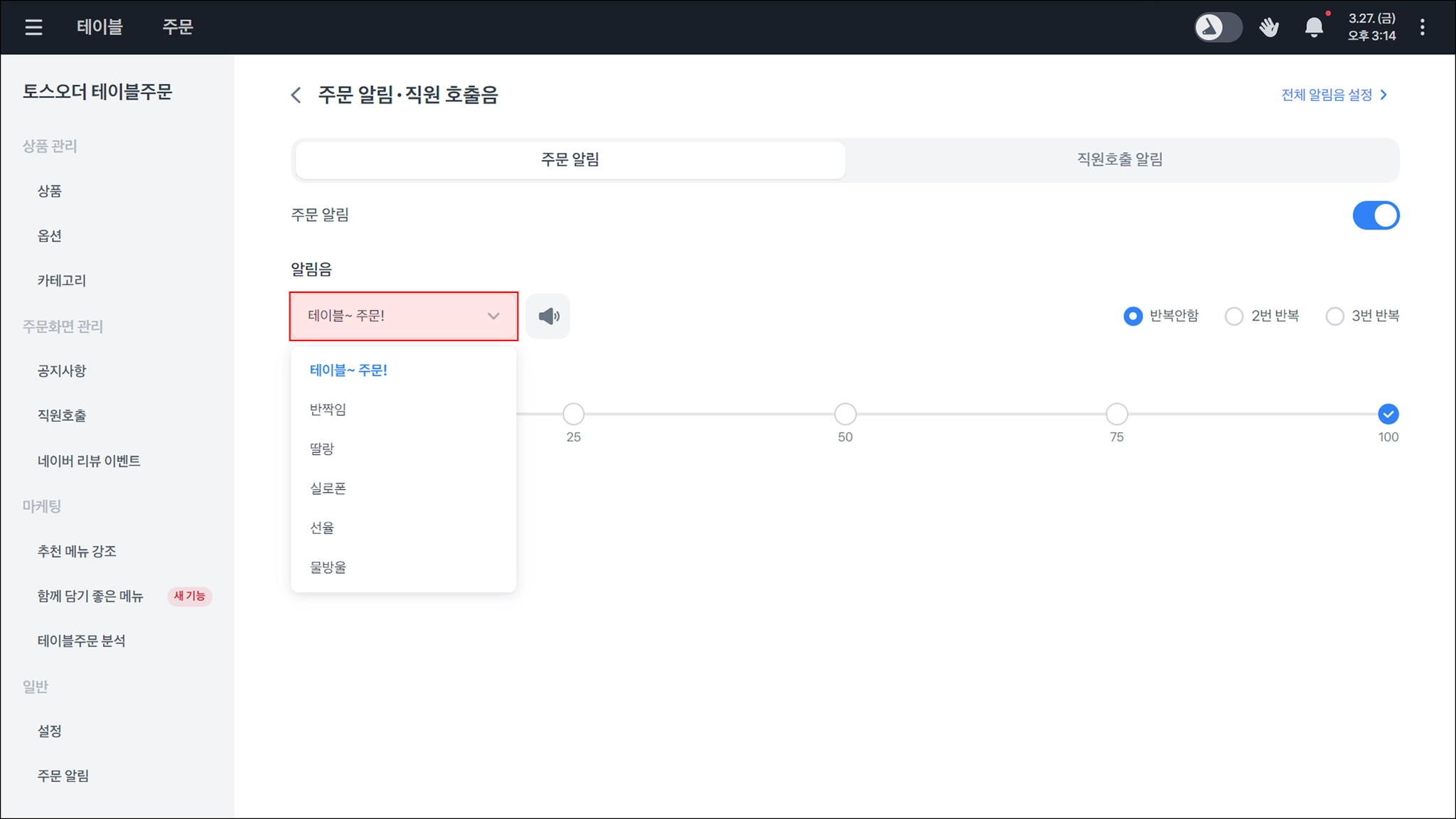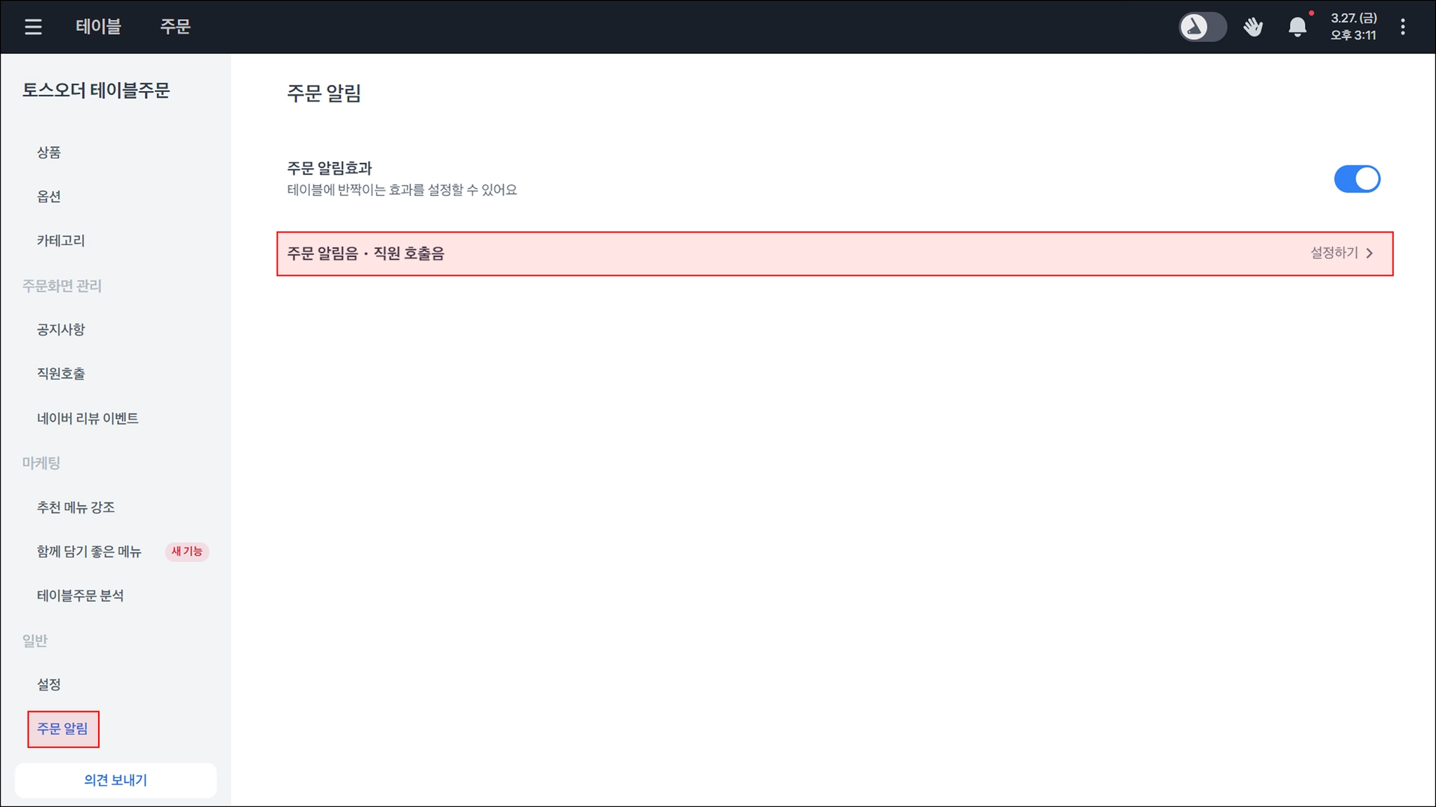 토스포스 왼쪽 상단 ≡ → 테이블주문 → 주문 알림→ 주문 알림음 · 직원 호출음을 누르면 설정을 하실 수 있어요.