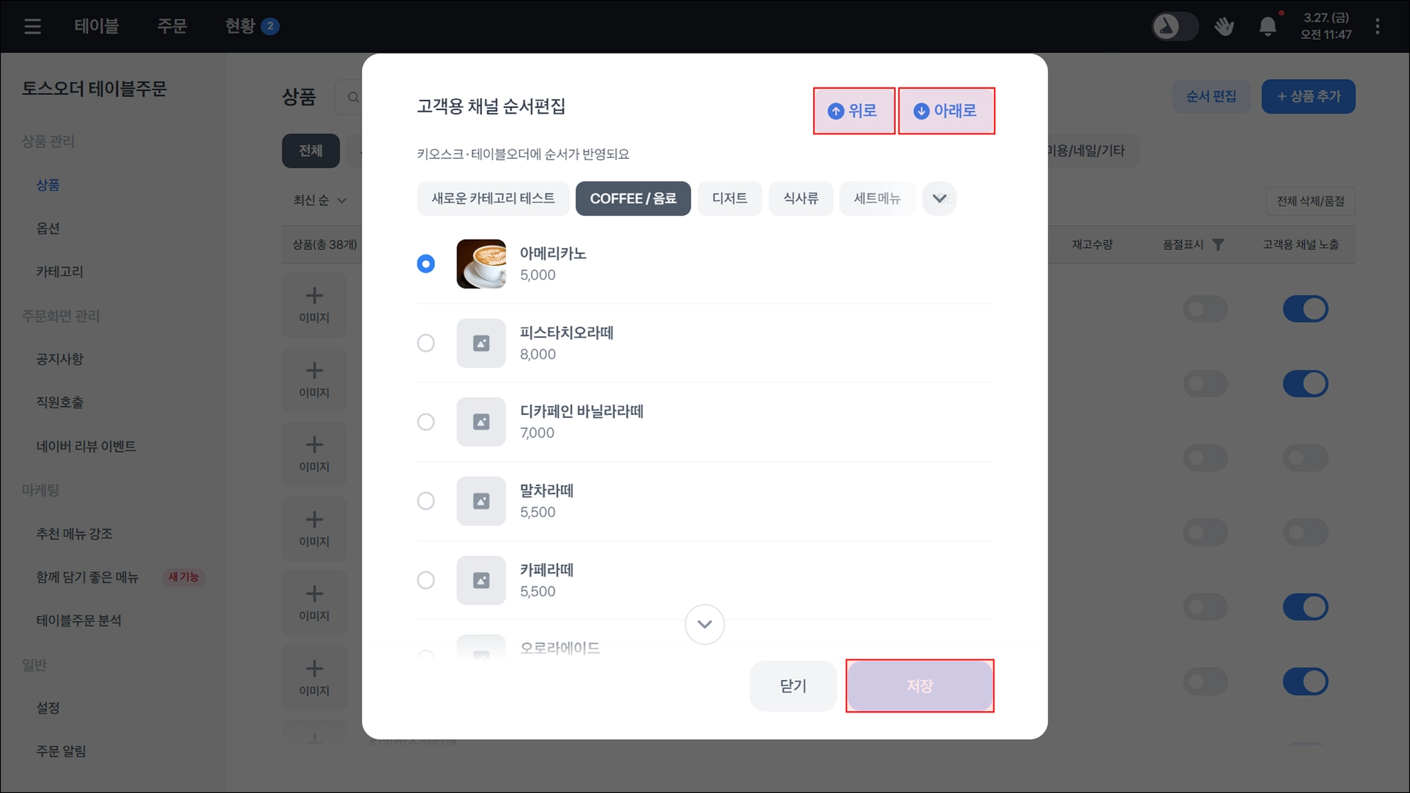 사장님용 포스 화면과 매장 손님용 고객 채널에서 보이는 상품 순서를 각각 다르게 설정할 수 있어요.