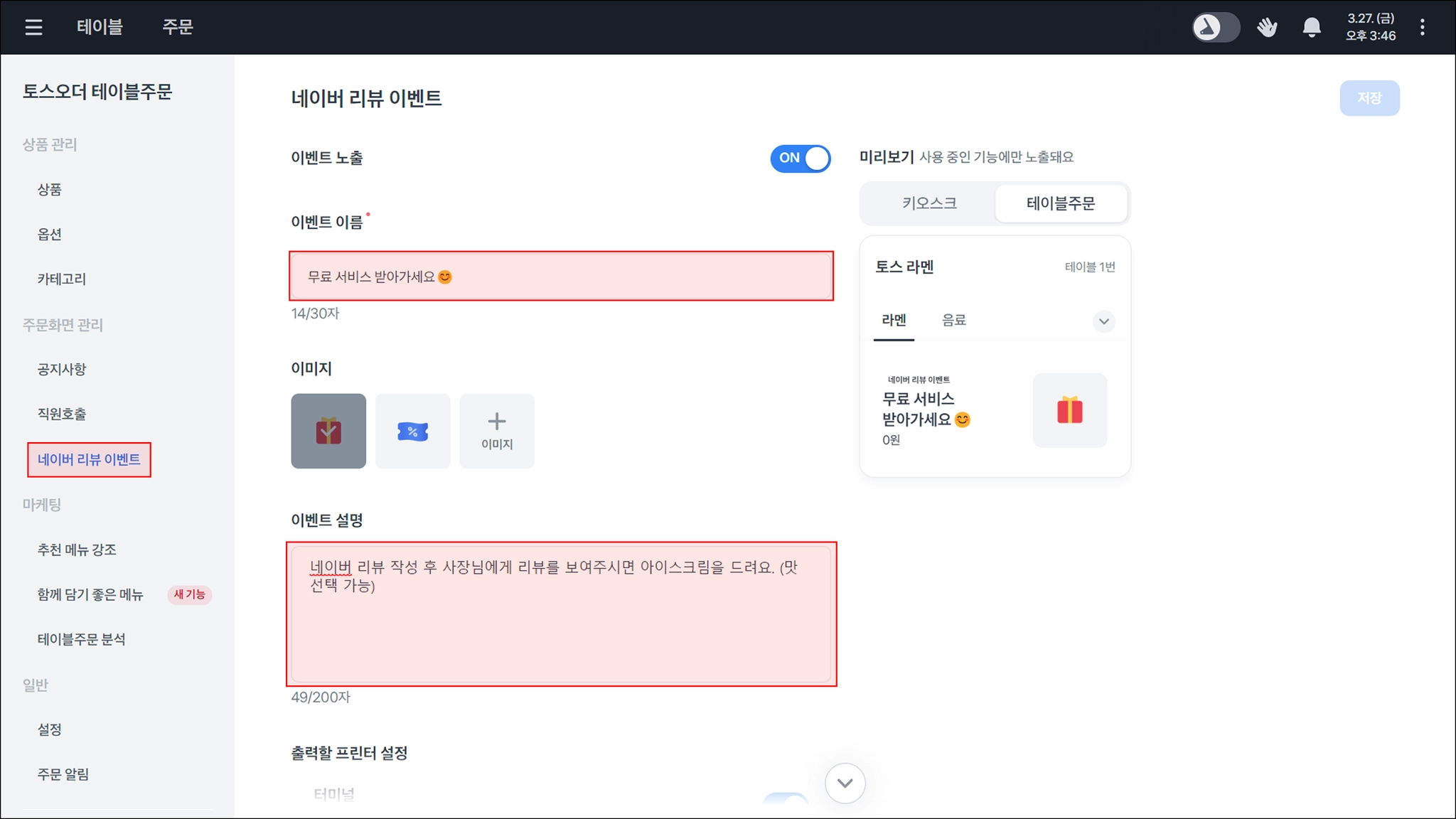 토스포스 왼쪽 상단 ≡ → 테이블주문 → 네이버 리뷰 이벤트를 눌러서 설정해 주세요.