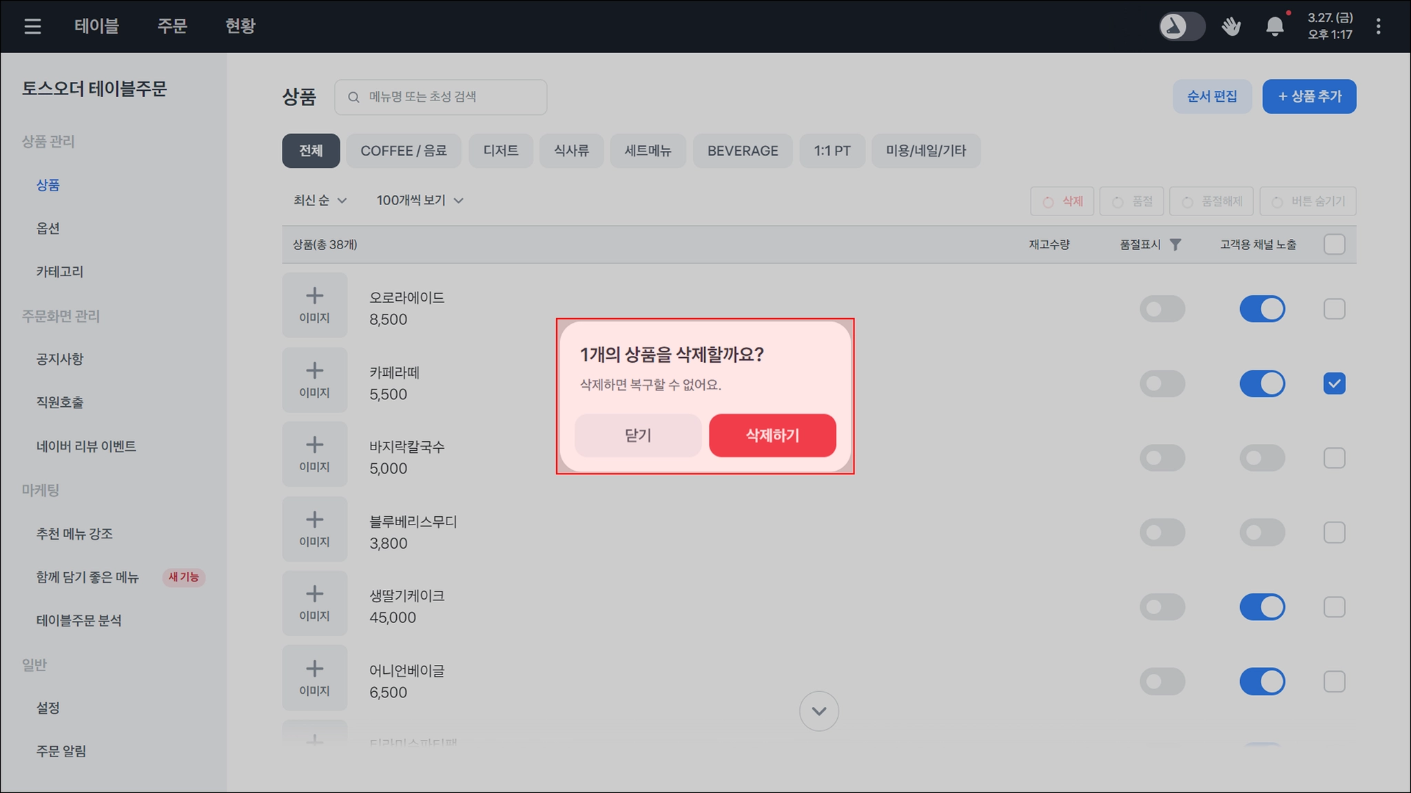 토스오더 테이블 주문에서도 상품을 삭제 또는 품절/품절해제 등록을 할 수 있어요.