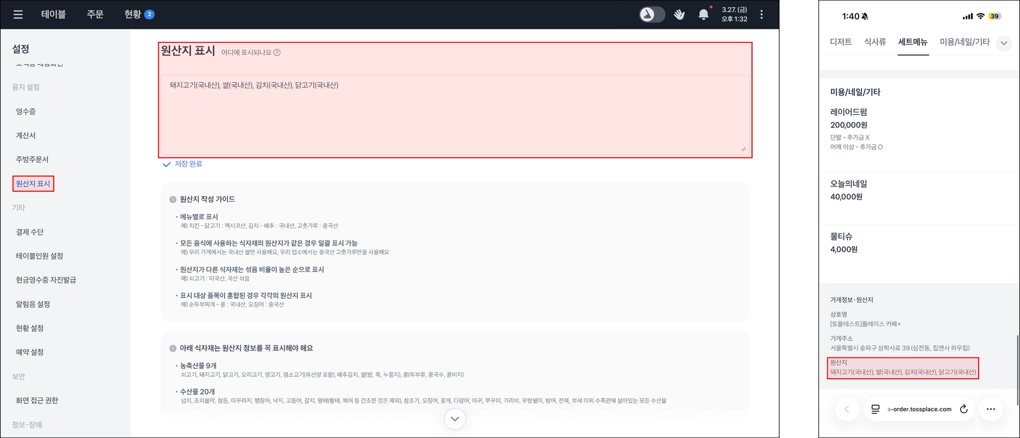 토스포스 왼쪽 상단 ≡ → 기타설정 → 원산지 표기를 눌러 주세요.