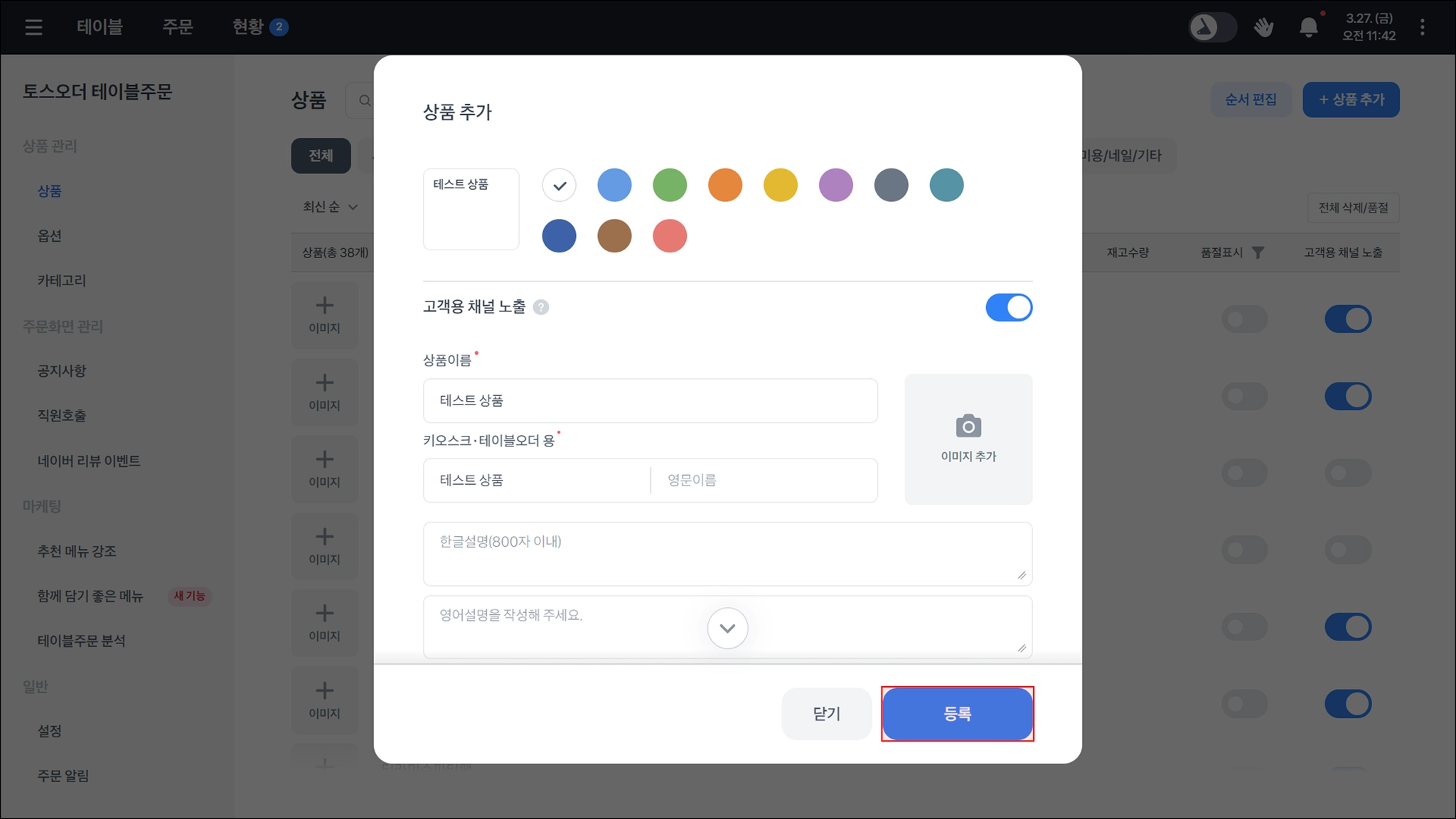 테이블주문 화면에 노출할 상품명, 상품설명, 이미지를 추가하고 등록 버튼을 눌러 주세요.