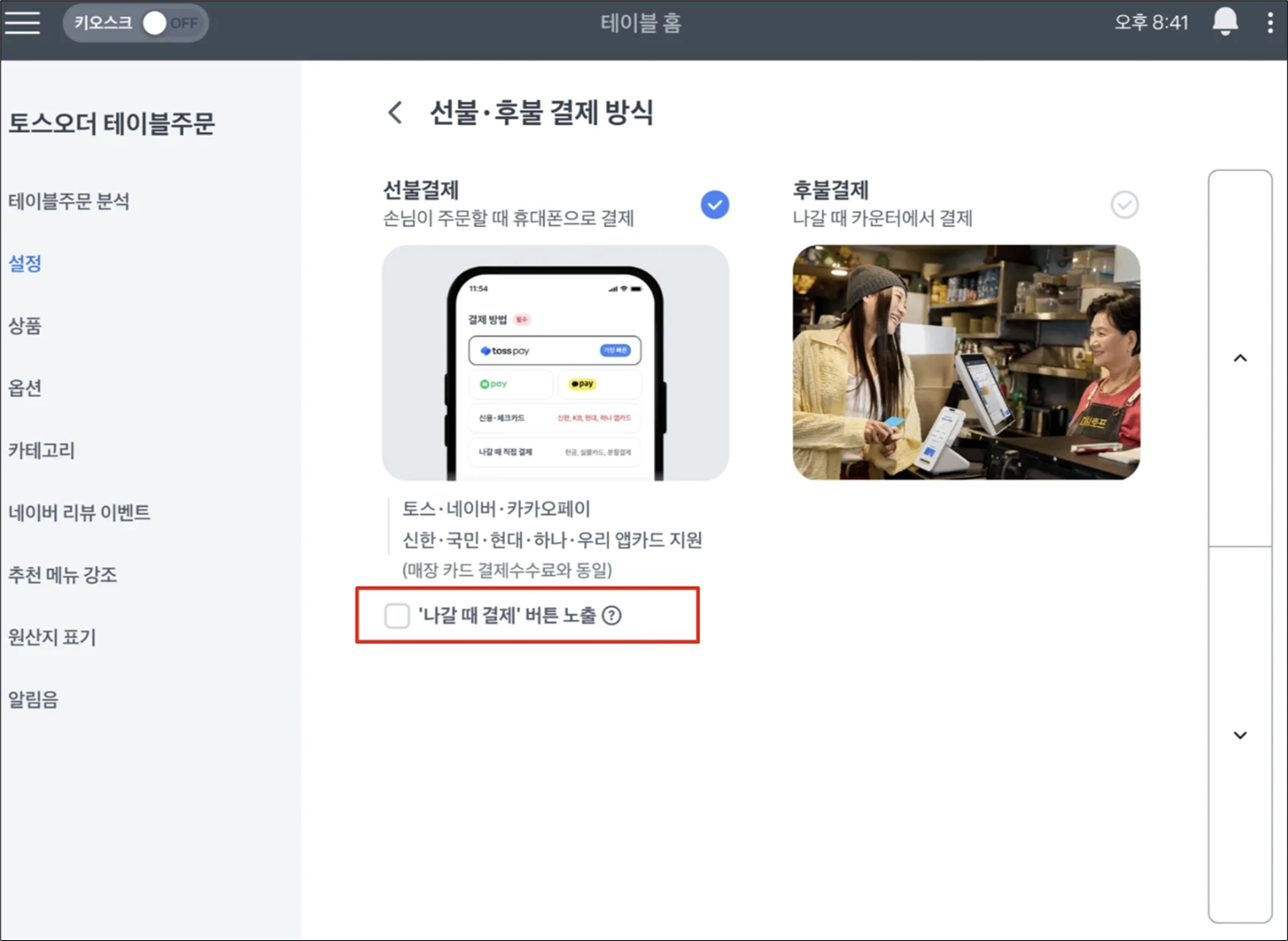 토스포스 왼쪽 상단 ≡ → 테이블주문 → 설정 → 선·후불 결제 방식 순서로 진행해요.