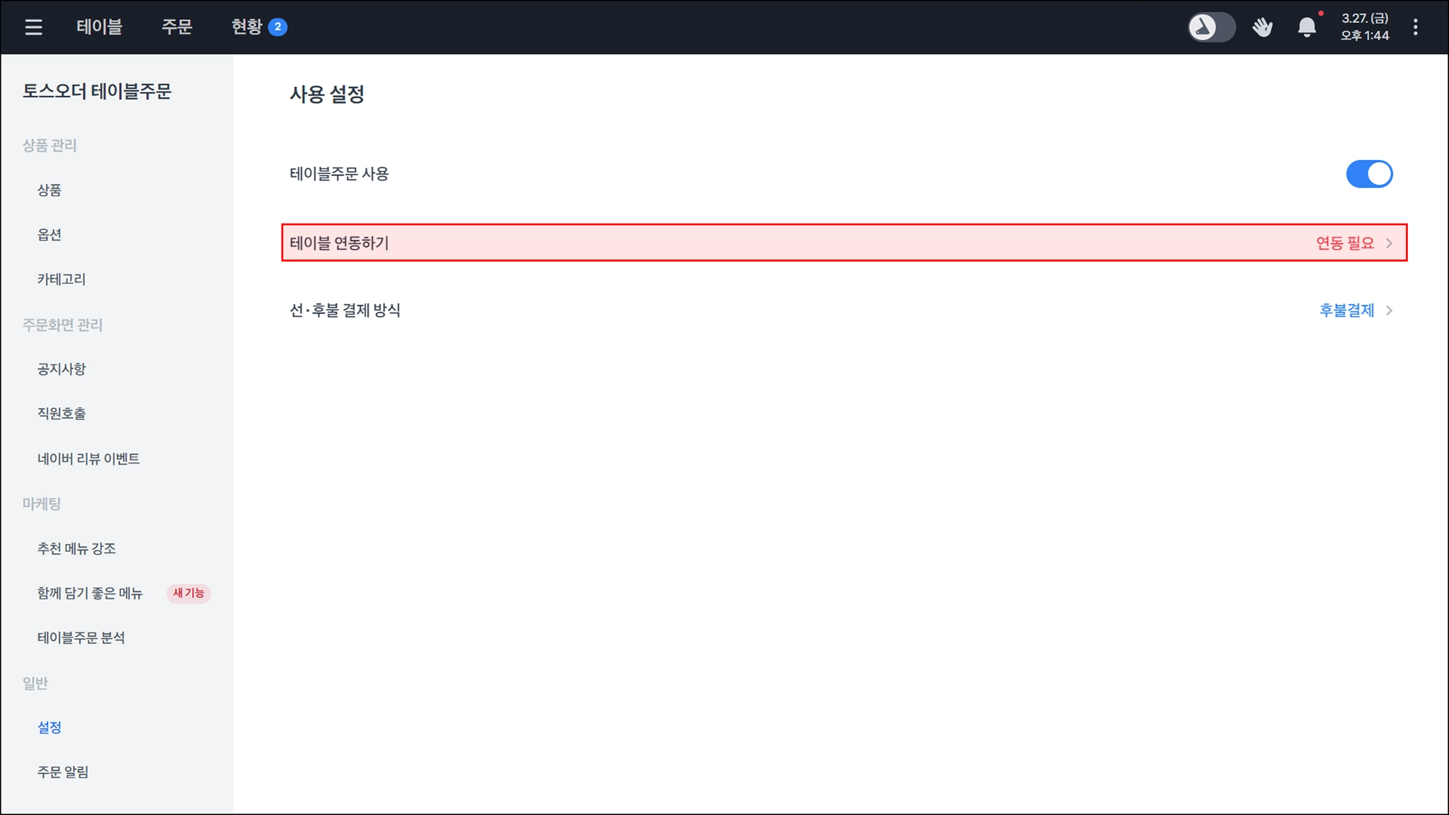 해당 설정은 테이블 주문 뿐만 아니라 토스 포스 상품에도 영향이 갈 수 있으니 꼭 주의해 주세요!
