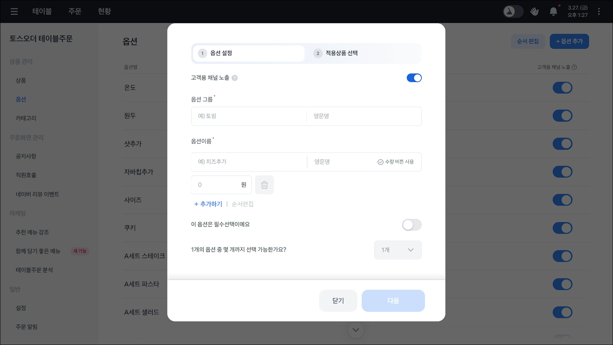 토스포스에서 옵션을 등록/수정할 수 있어요.