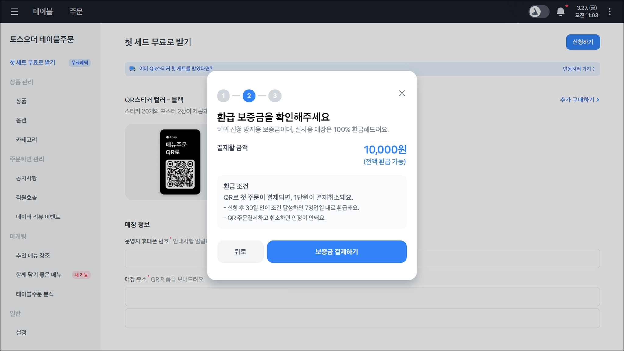테이블 주문(QR) 최초 신청 시 보증금 결제가 진행되어요.