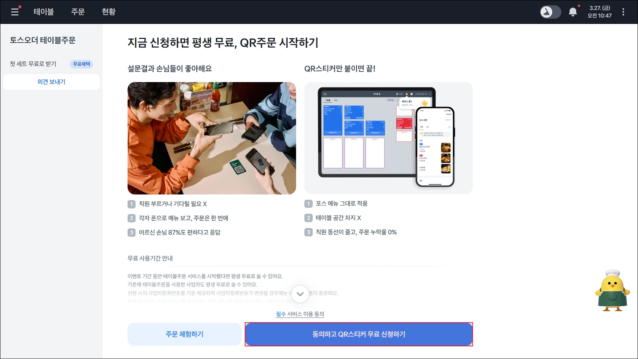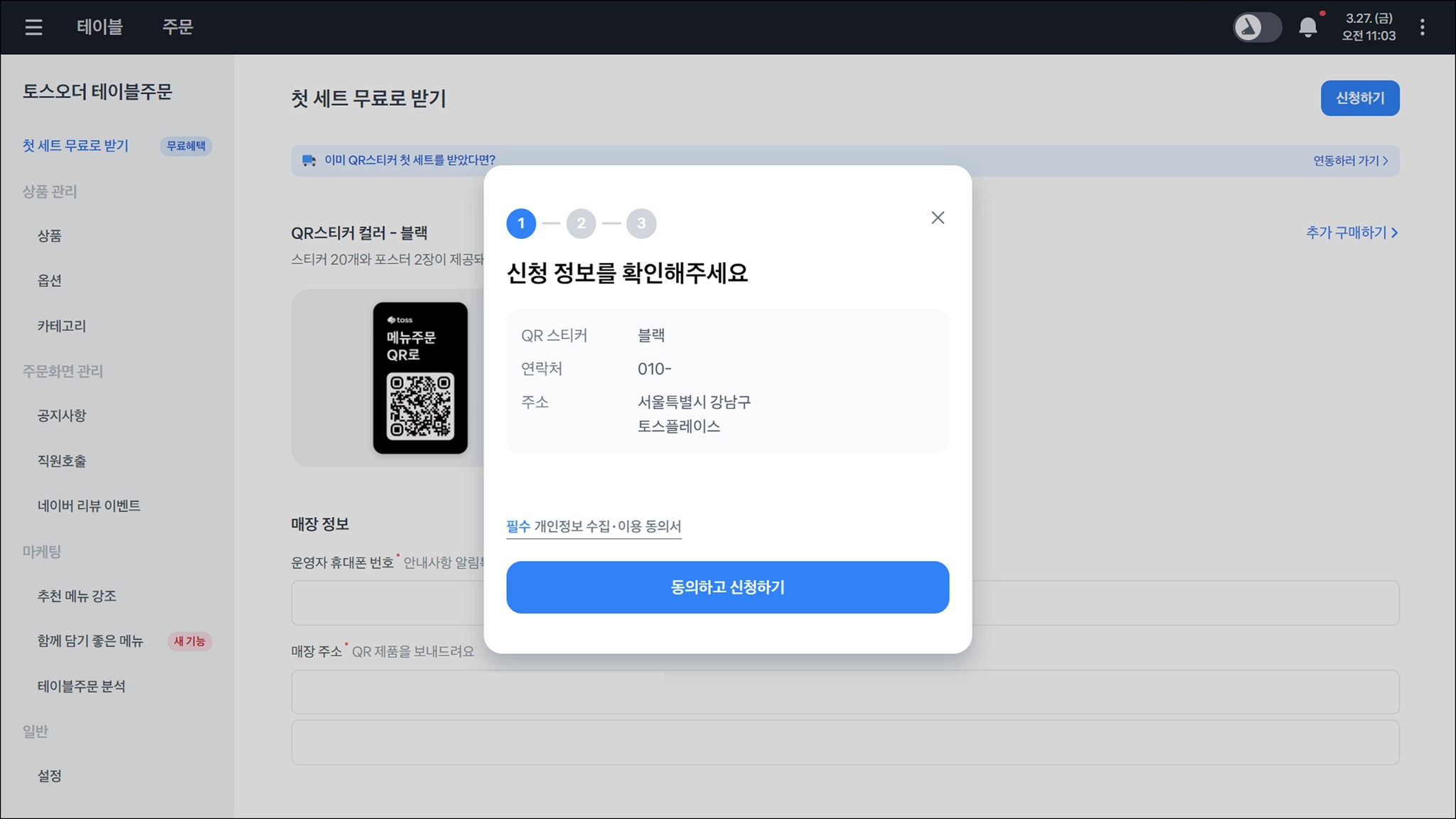 동의하고 테이블QR스티커 무료 신청하기를 눌러주세요.