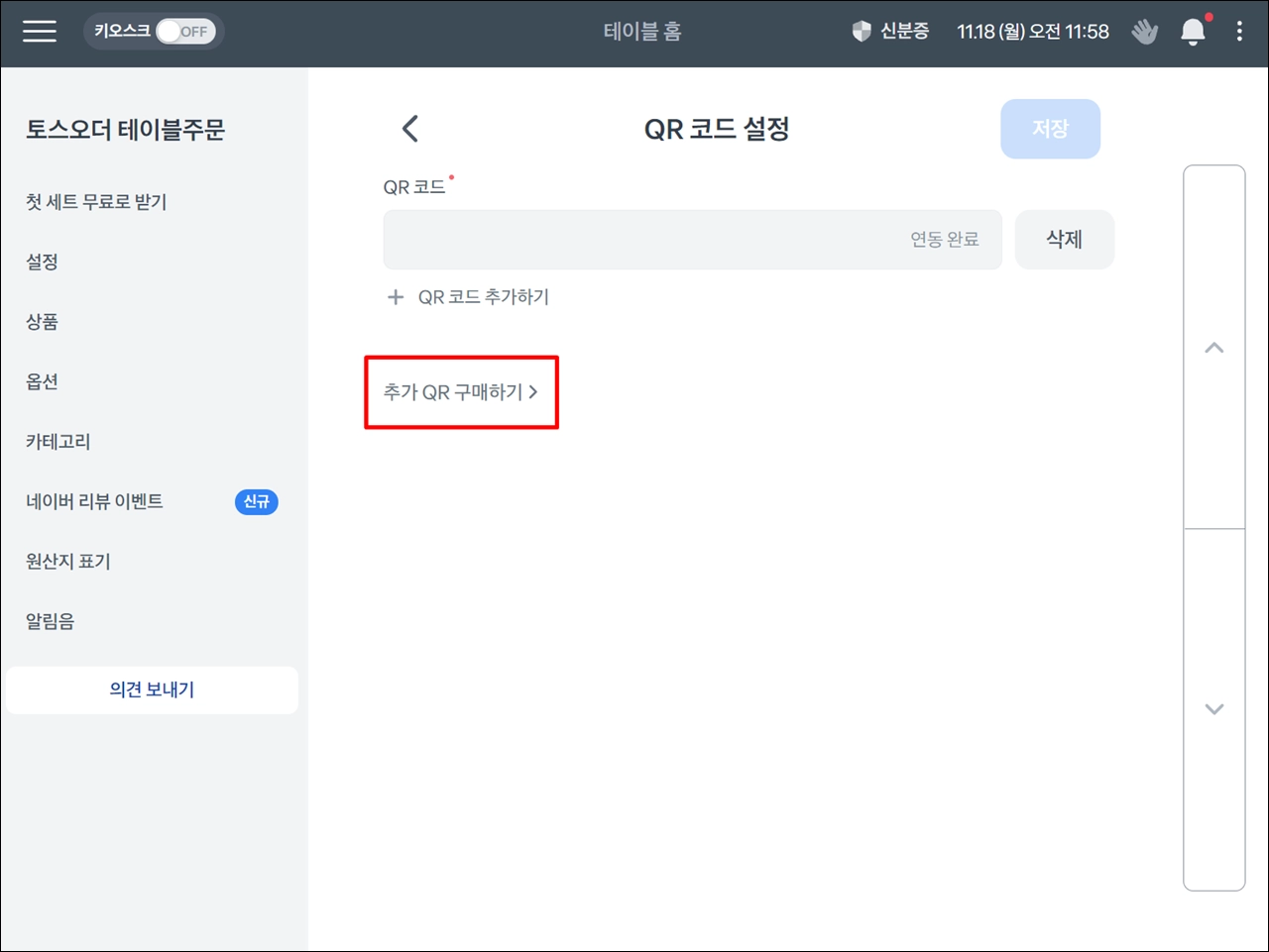 추가 구매가 필요할 경우, QR 코드 설정 >을 누르신 후 추가 QR 구매하기 > 를 눌러 주문 해주세요.