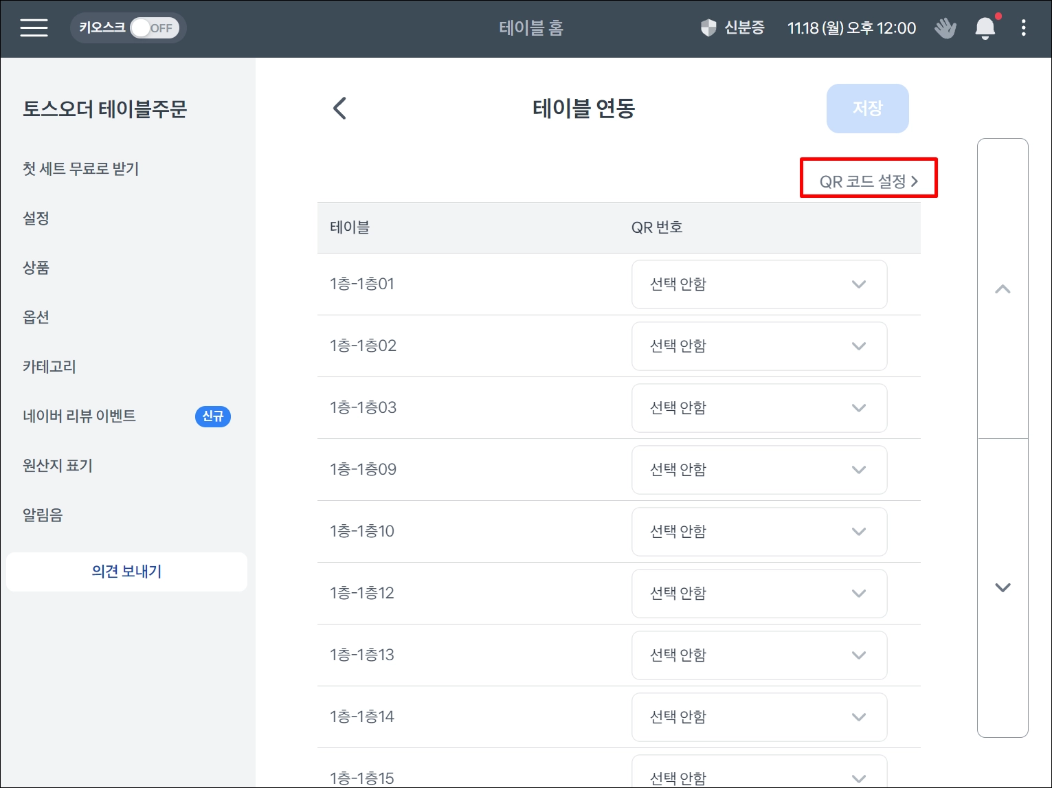 포스에 설정해놓은 테이블과 QR코드에 기재된 번호를 선택하여 연동해 주신 후 상단의 저장 버튼을 꼭 눌러 주세요.