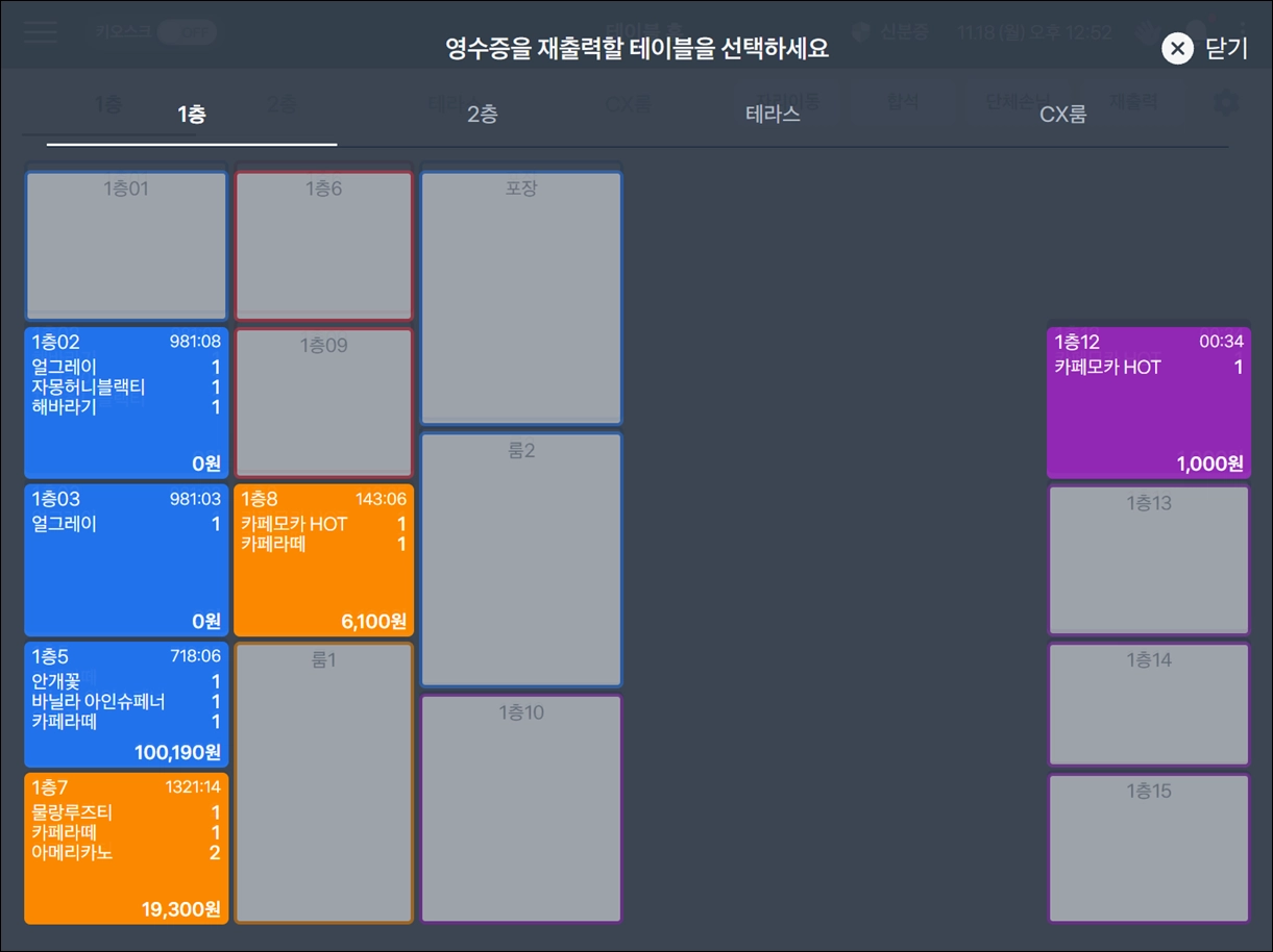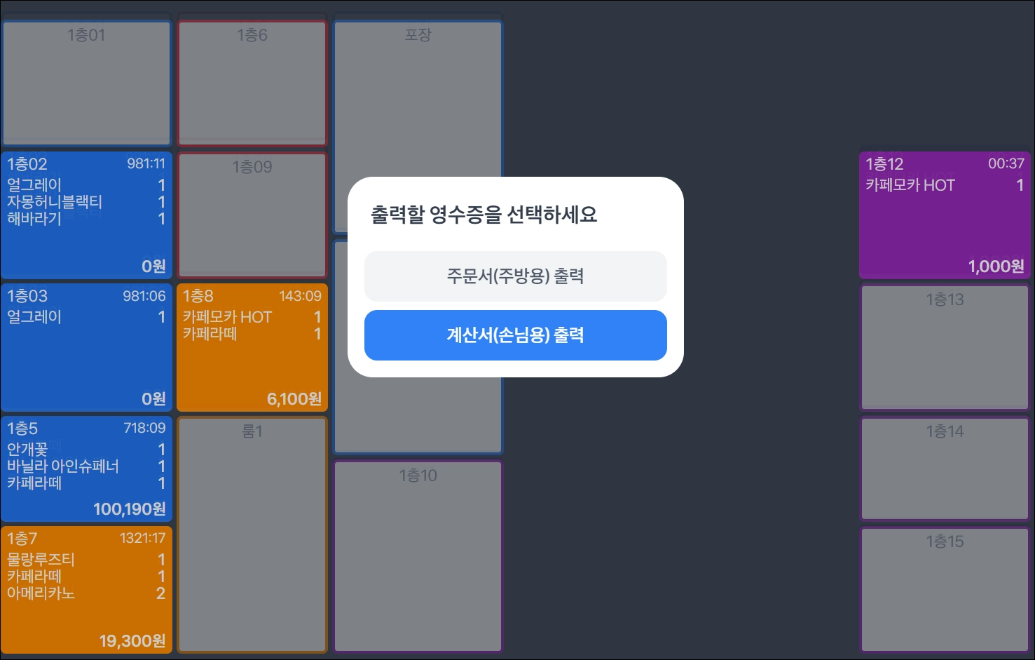주문서 출력을 원하는 테이블을 선택해 주신 후 출력할 영수증을 선택해 주세요.