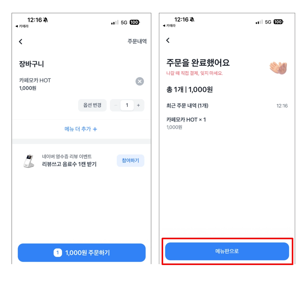모두 상품을 담았다면 주문하기 버튼을 눌러서 주문을 완료해요. 만약, 추가 주문이 필요하다면 메뉴판으로 버튼을 눌러 주시면 되어요.