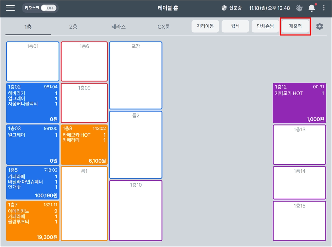 주문서 재출력이 필요하신 경우 토스 POS 상단의 재출력 버튼을 눌러 주세요.