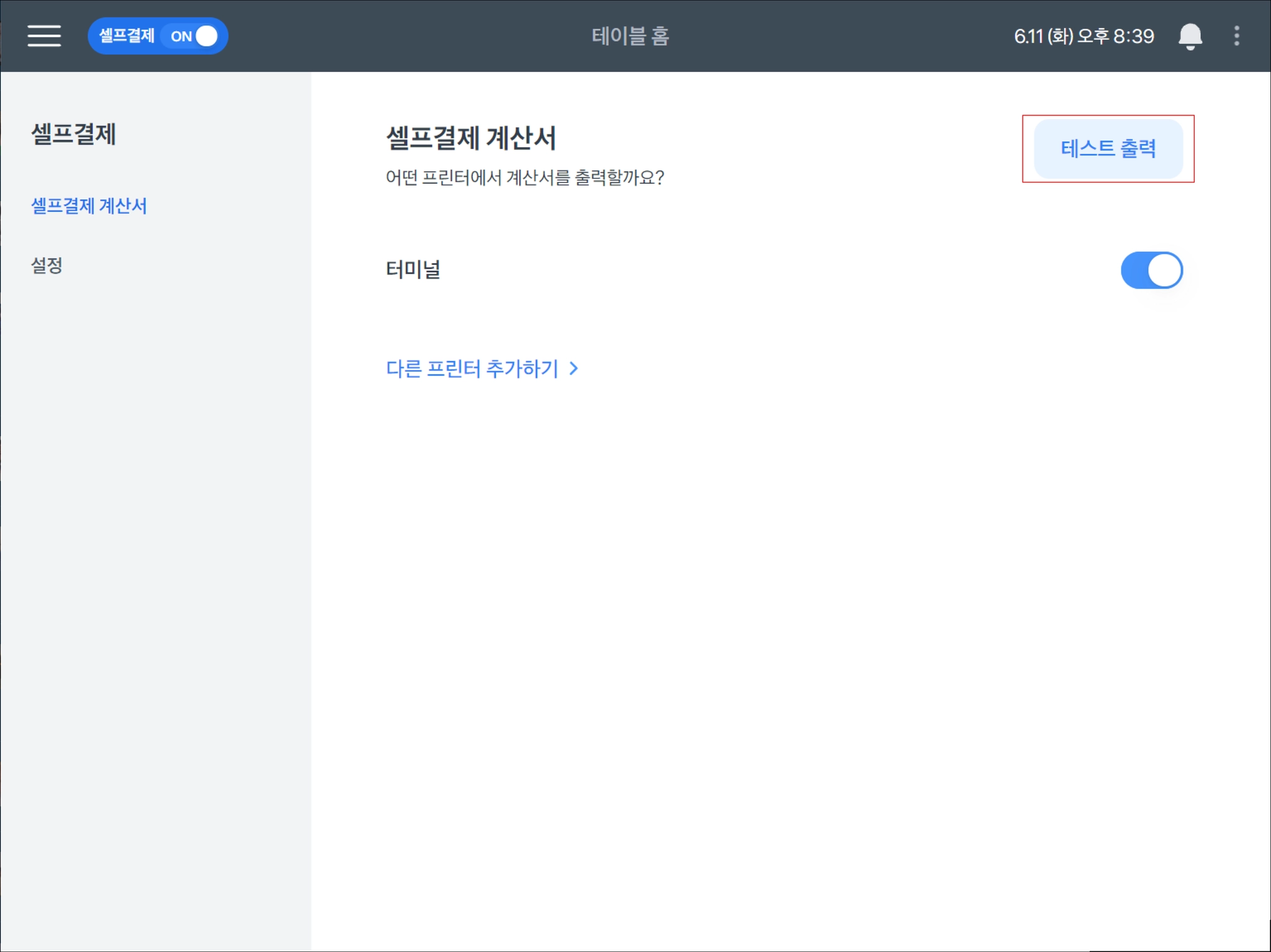 토스포스 → 왼쪽 상단 ≡ → 셀프결제 → 셀프결제 계산서에서 테스트 출력을 하고, 잘 출력 되는지 확인해주세요.