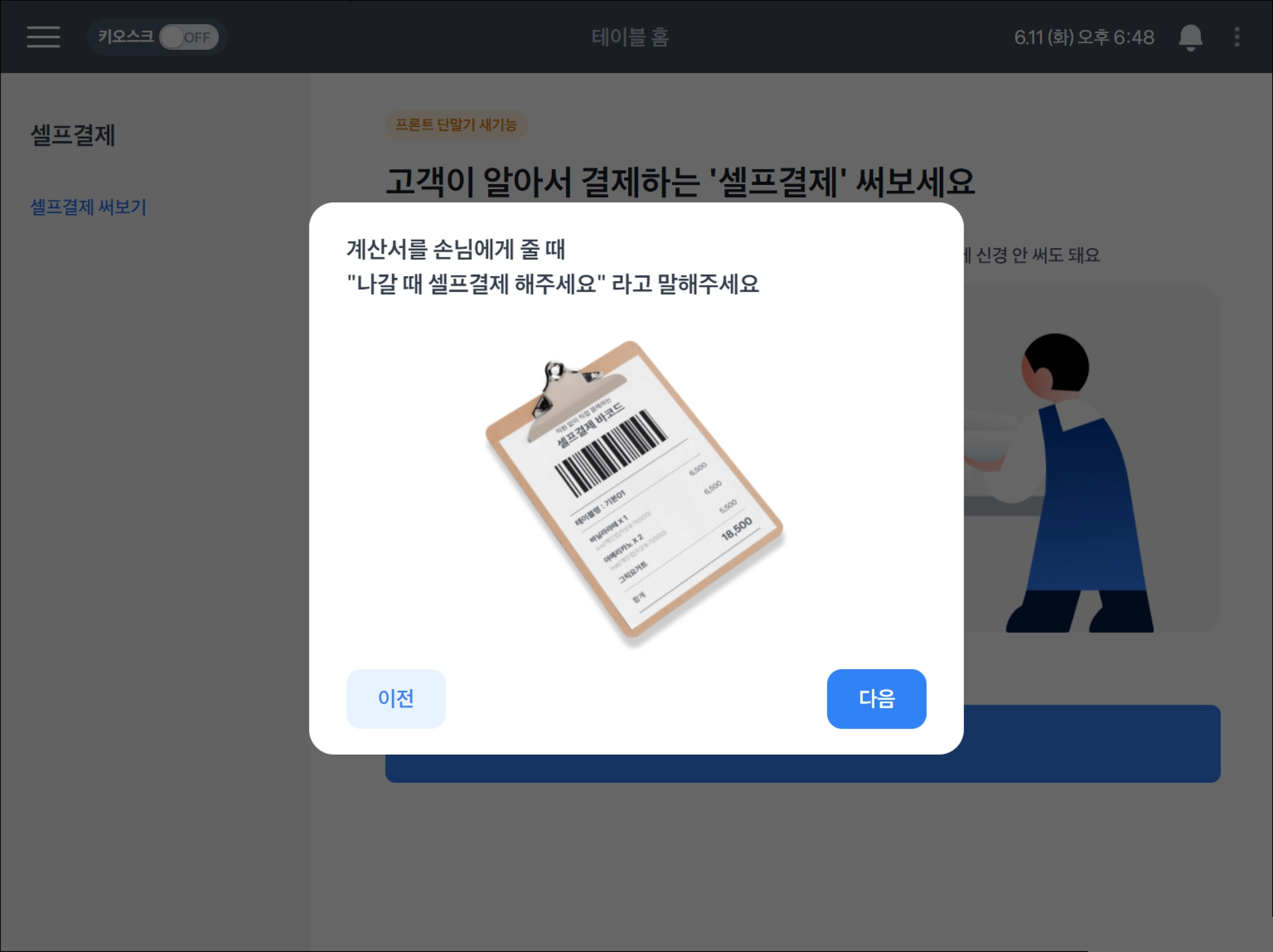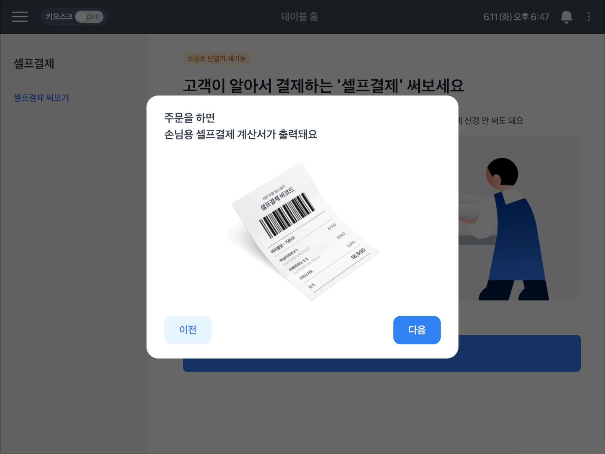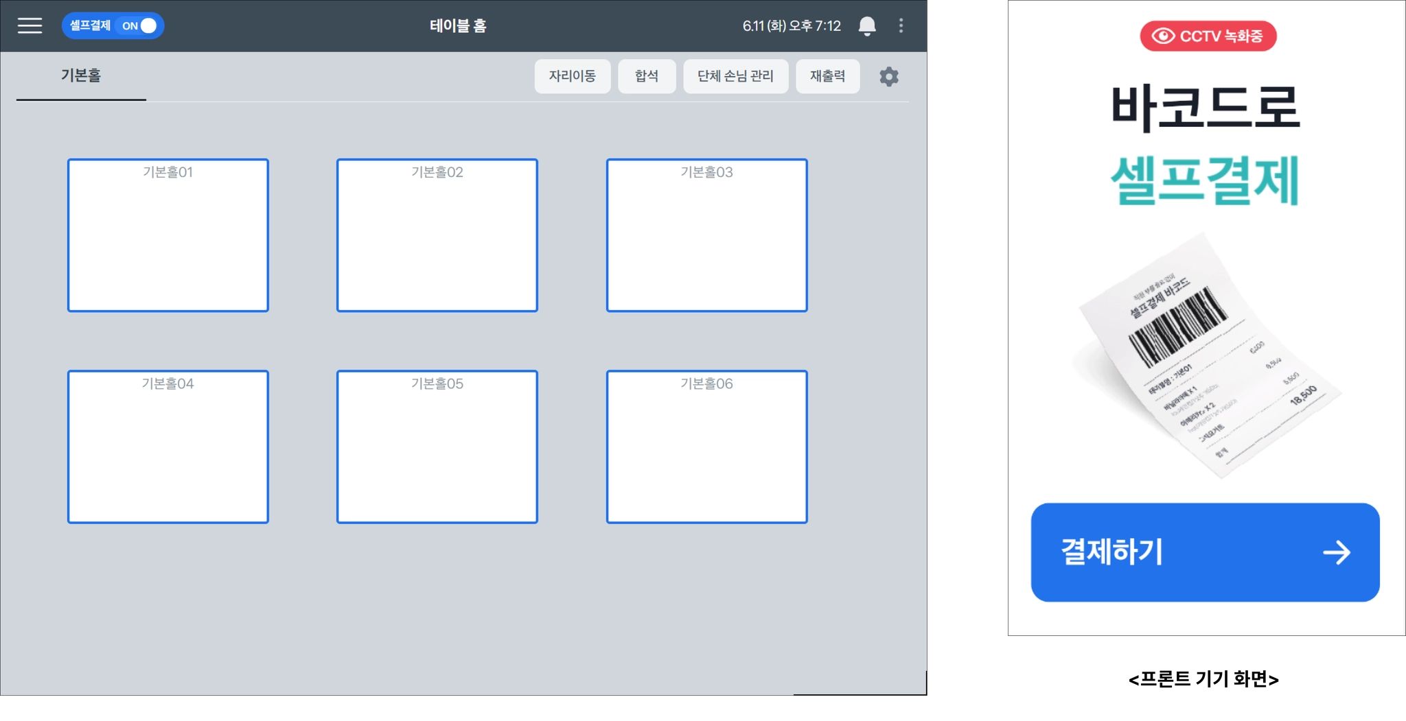 셀프결제 기능을 켜면 프론트 첫 화면이 이렇게 바뀌어요.