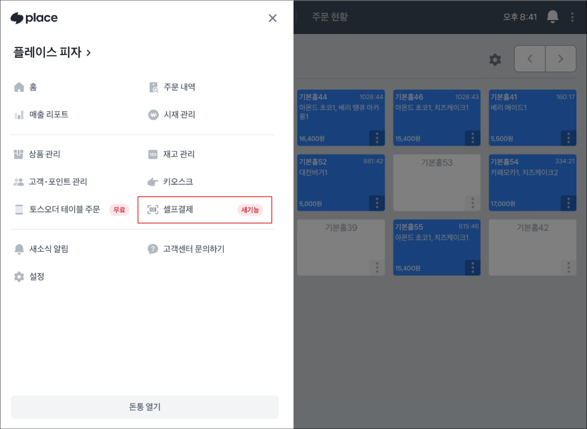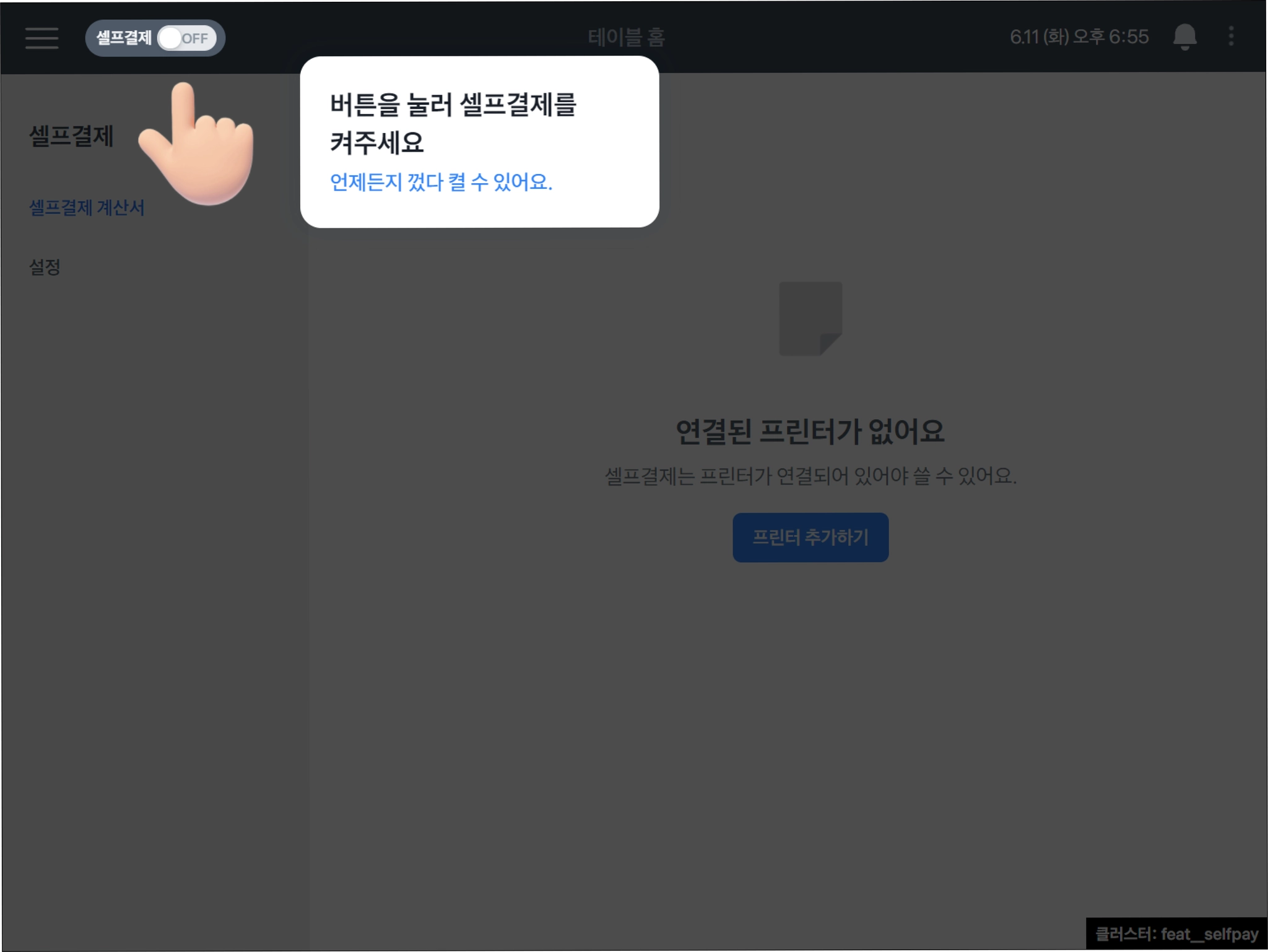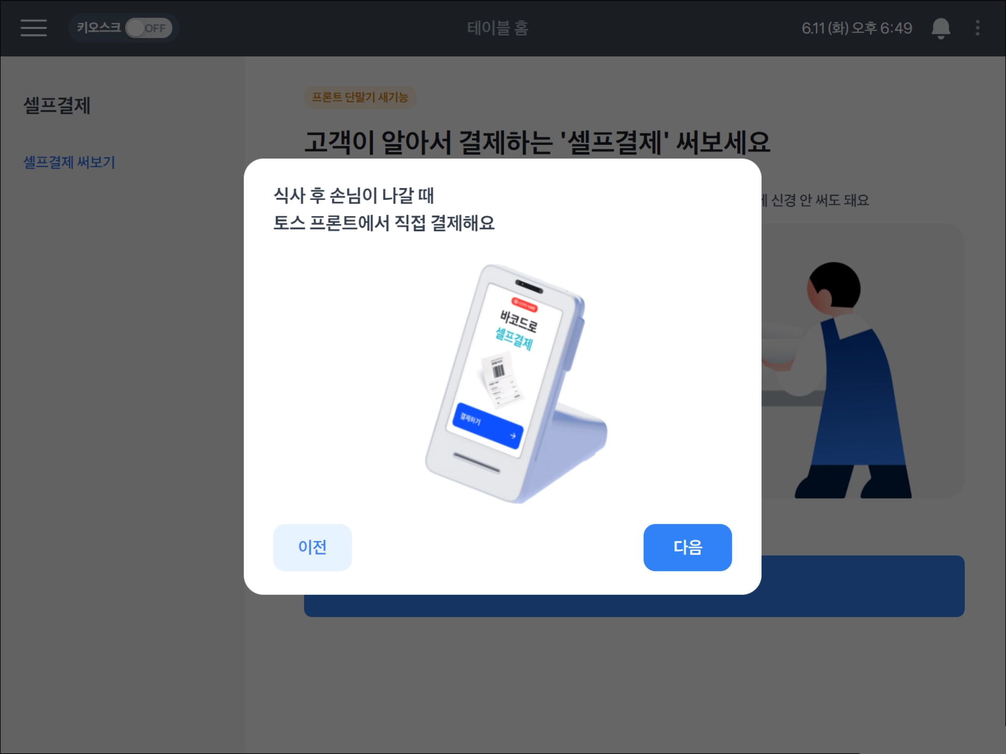 셀프결제 기능을 켜면 프론트 첫 화면이 이렇게 바뀌어요.