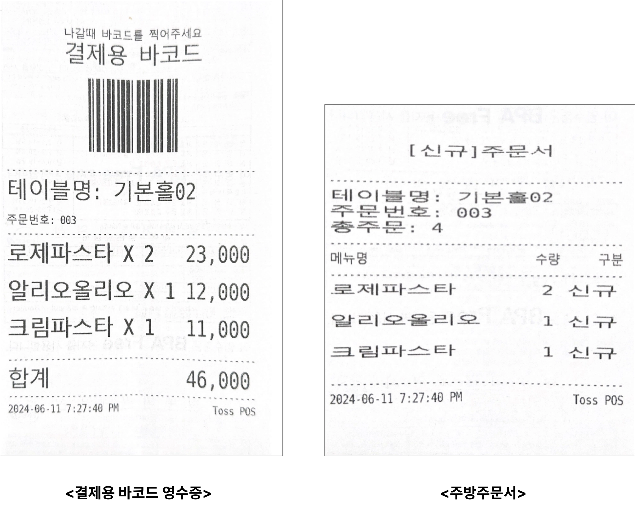 주문이 완료되면 셀프결제 계산서가 출력되고, 고객님께 전달해주세요.