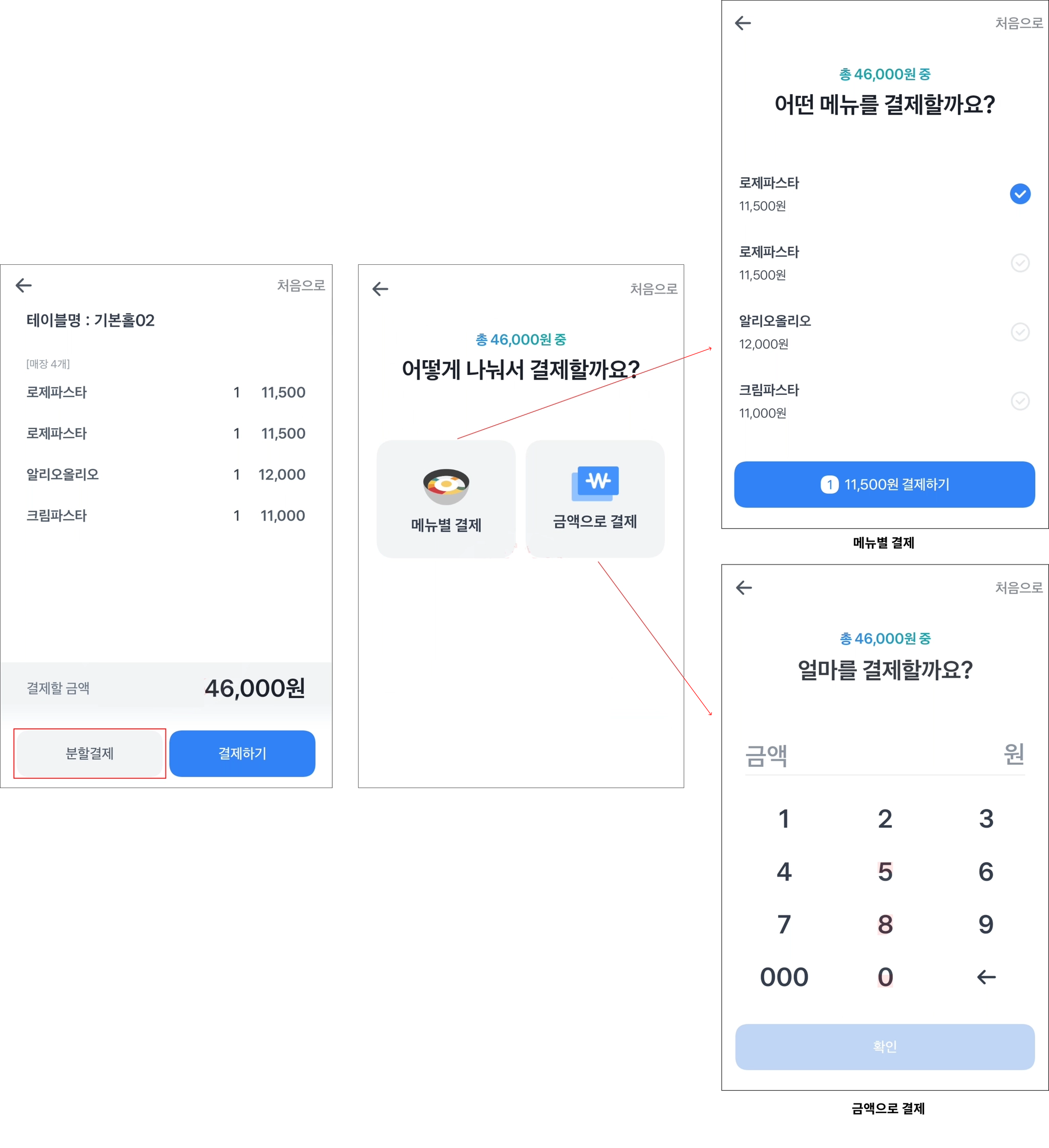 만약 분할결제를 원할 경우, 분할결제 버튼을 누르고 메뉴별로 결제할 지 / 금액으로 결제할 지를 선택해주세요.