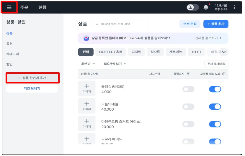 포스 왼쪽 상단 ≡ → 상품 → 상품 할인에서 상품 한 번에 추가 가 가능해요.