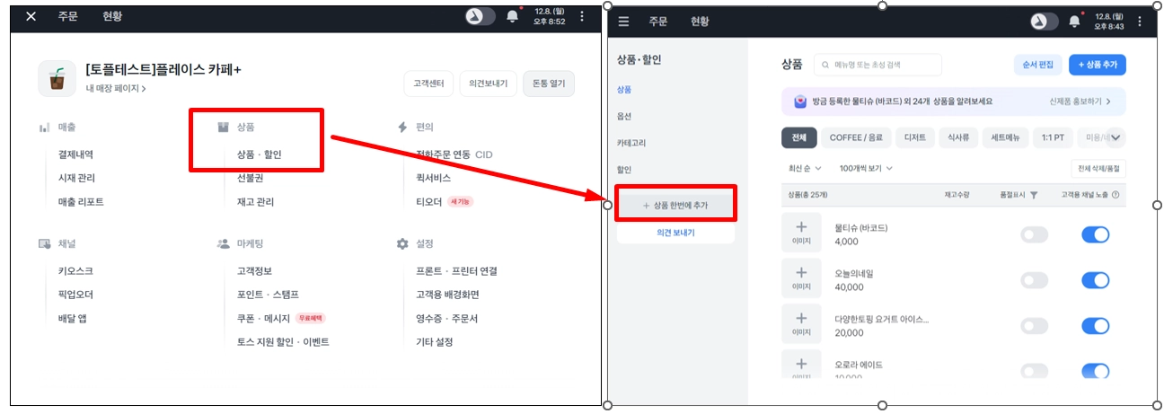 포스 왼쪽 상단 ≡ → 상품 → 상품 할인에서 상품 한번애 추가 가 가능해요.