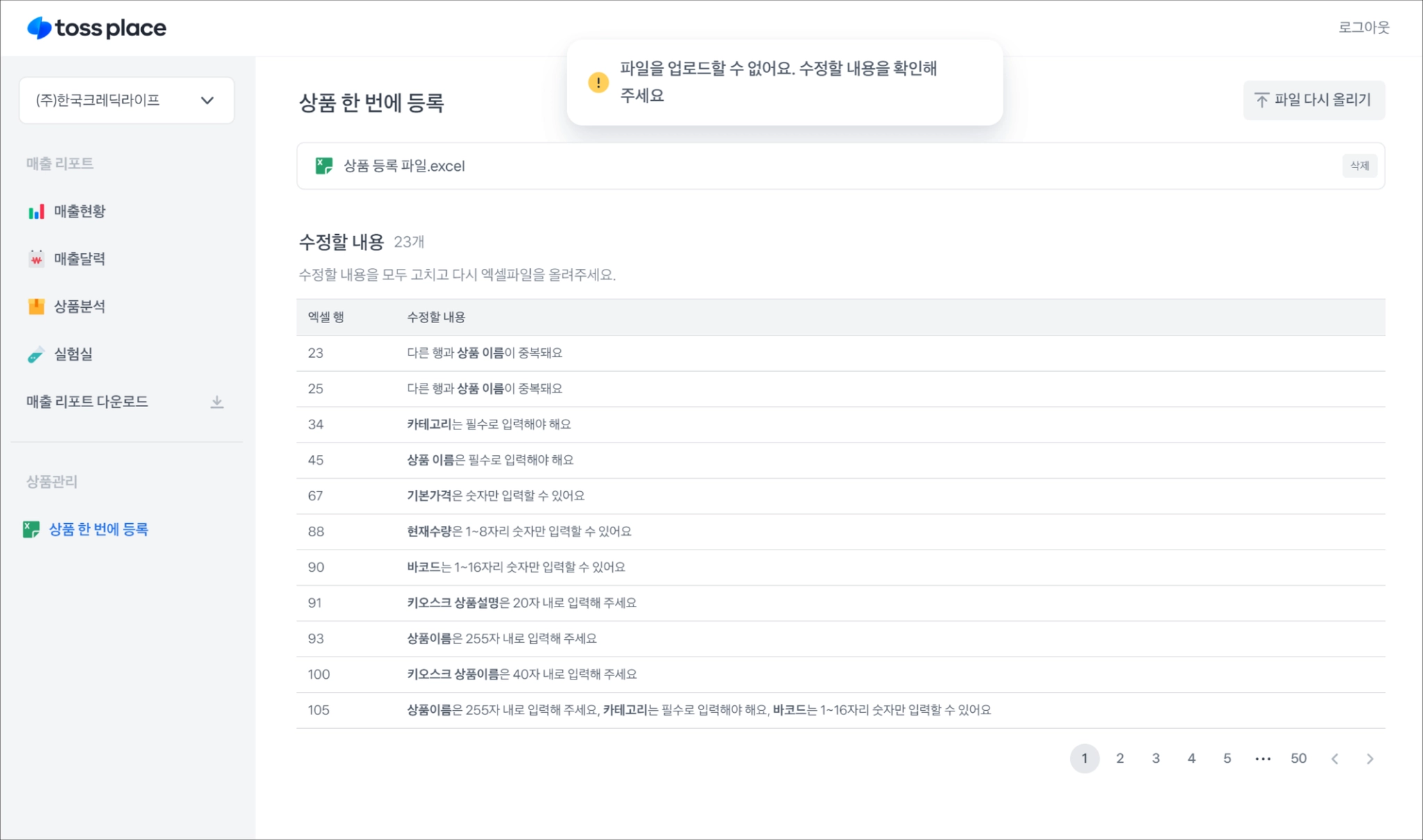 엑셀 파일에 오류사항이 있다면, 수정할 내용이 표시돼요.
