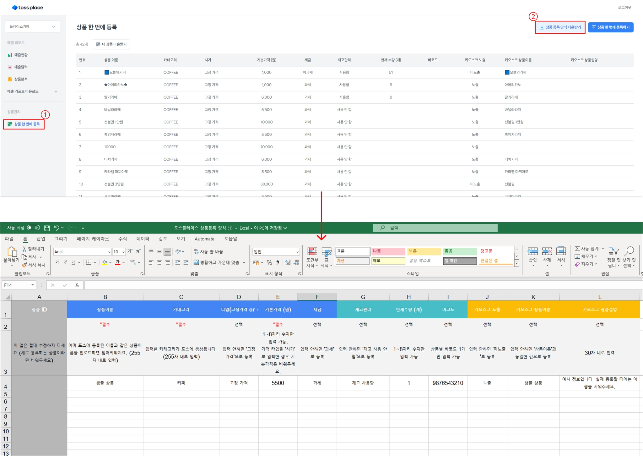 [상품 한 번에 추가] 메뉴를 눌러 상품 등록 양식을 다운 받아 업로드 할 상품을 입력해 주세요.