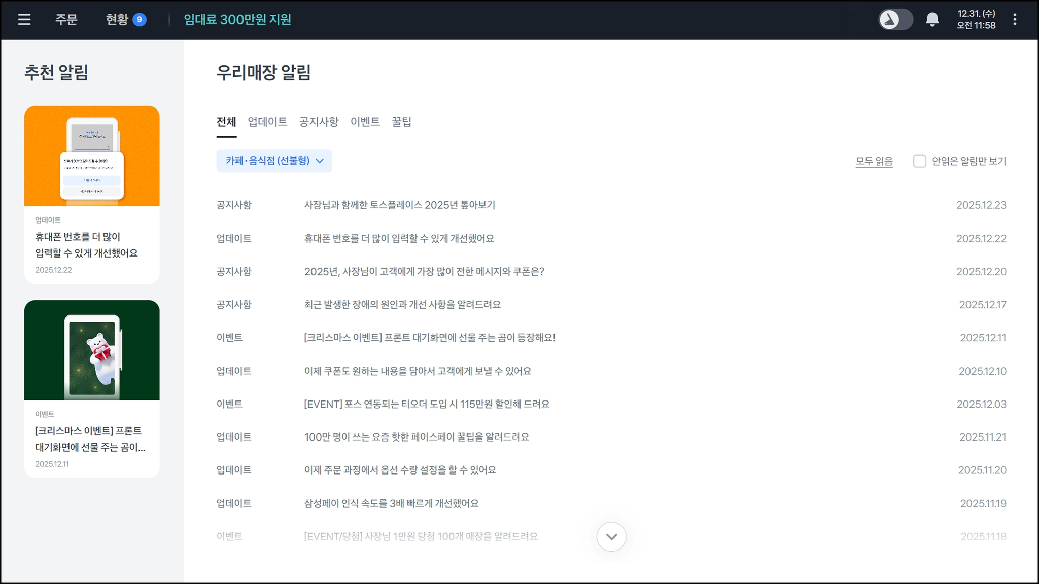 토스포스에 새로 나온 기능과 개선 사항, 중요 소식 등을 사장님께 알려드려요
