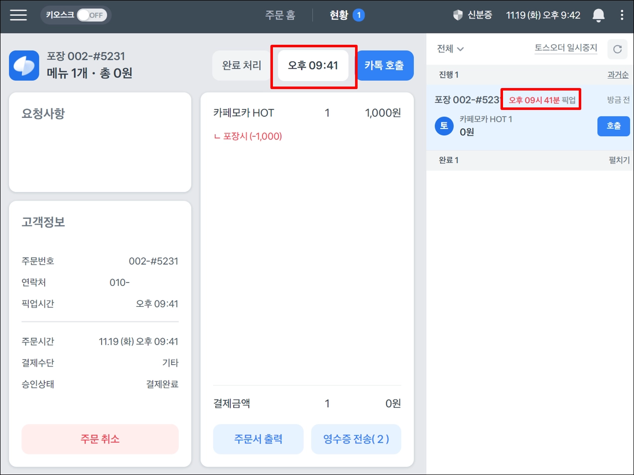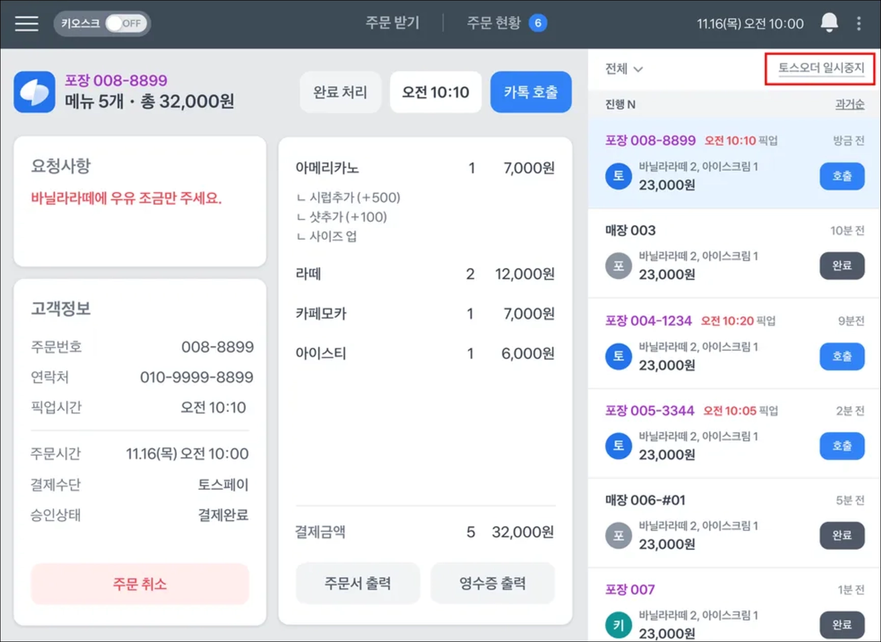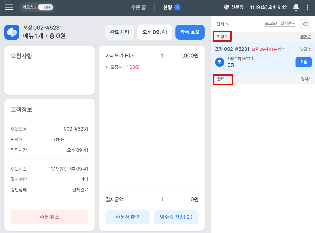 완료 처리 또는 카톡 호출을 누르면 주문이 진행 상태에서 완료 상태로 옮겨지게 되어요.