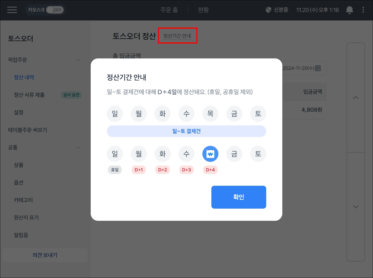 포스 왼쪽 상단 ≡ 버튼 > 키오스크·토스오더 > 토스오더 관리 > 정산 내역에서 확인 할 수 있어요.