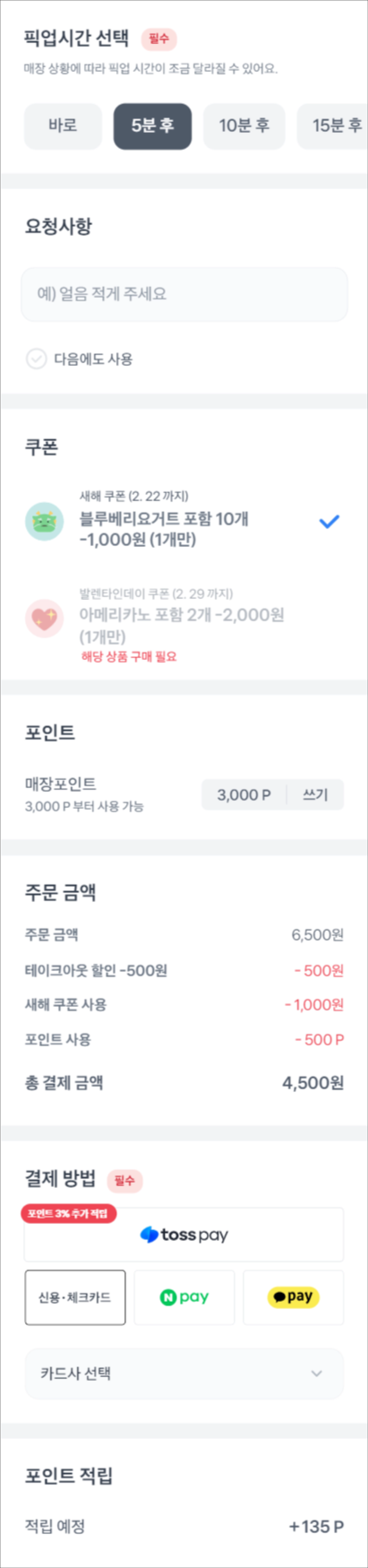 주문 화면에서 매장에서 받은 쿠폰을 적용 시키거나, 포인트를 사용할 수 있어요.