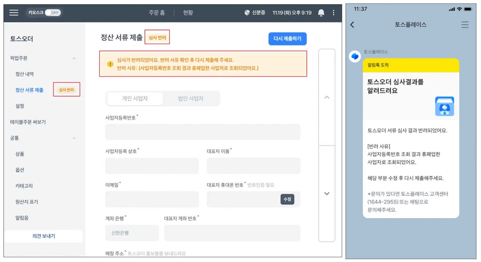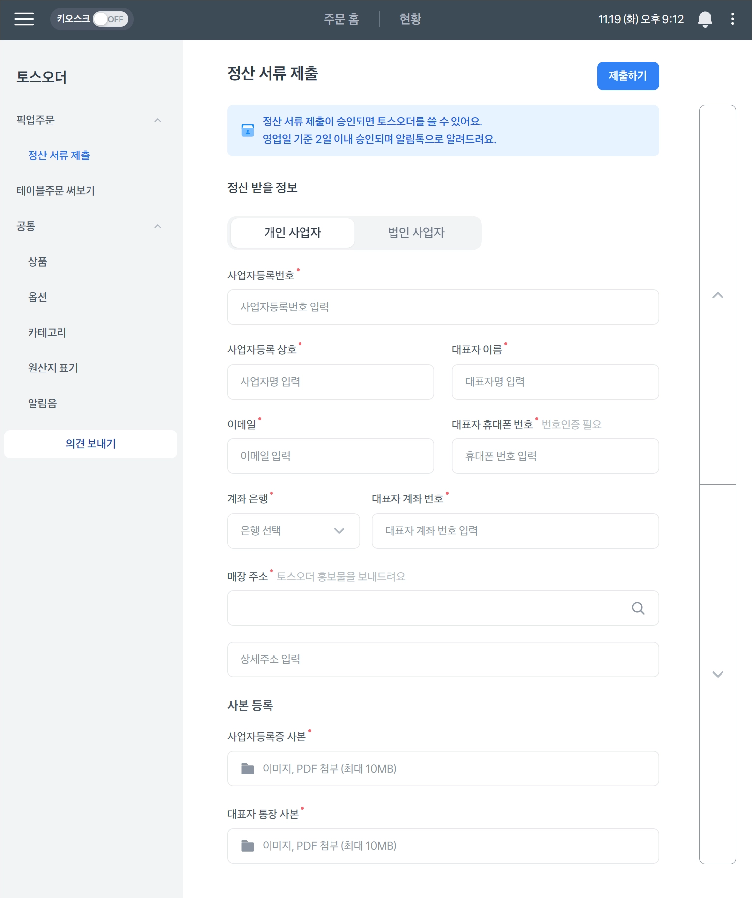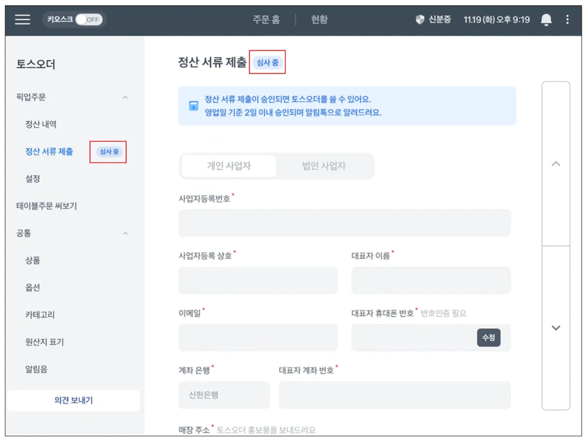 토스오더 정산 서류 제출~심사