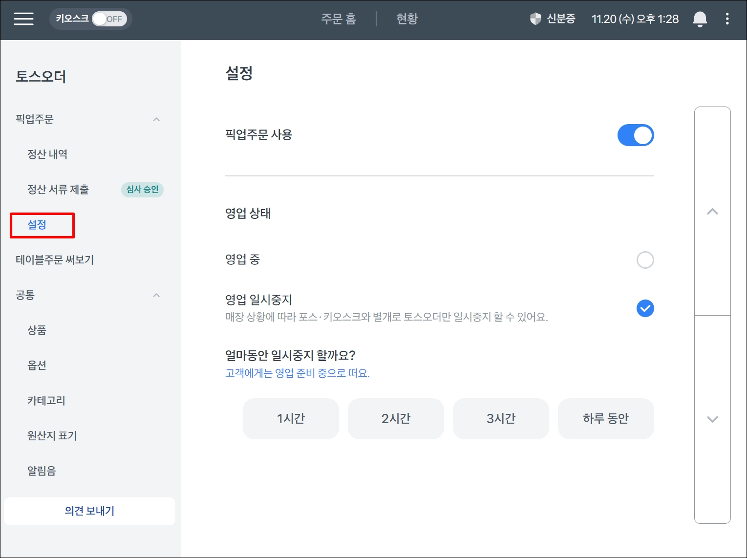 포스 좌측 상단 ≡ > 키오스크·토스오더> 토스오더 관리 > 영업상태 > 영업 일시중지 활성화 & 비활성화