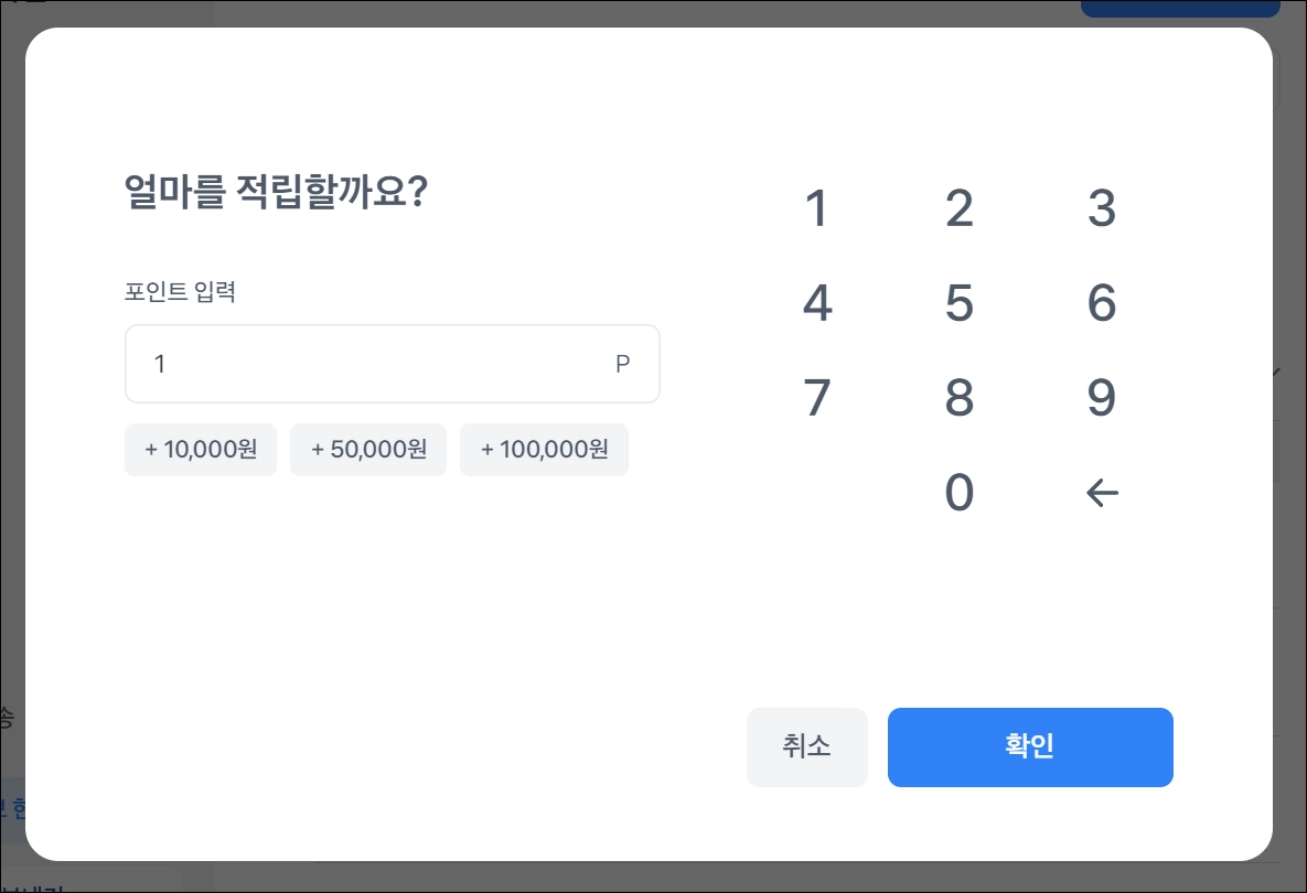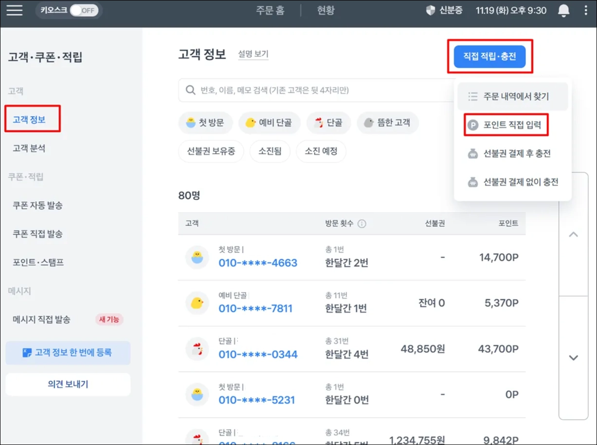 포스 좌측 상단 ≡ > 고객・포인트 관리 > 고객 정보 > 직접 적립.충전 에서 포인트 직접 입력을 눌러주세요.