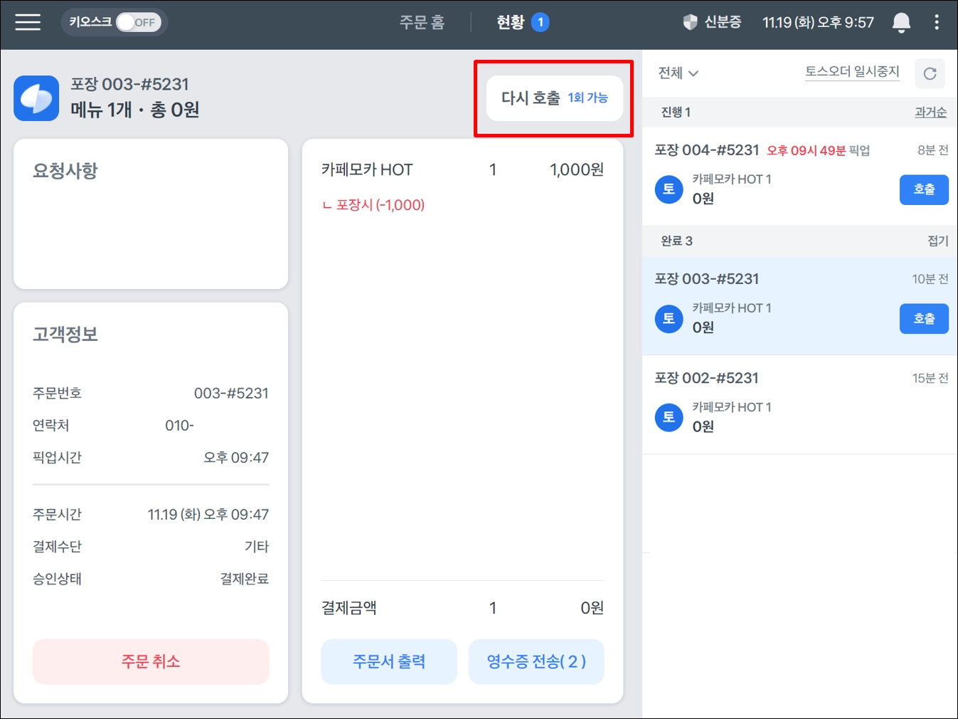 이미 호출한 주문건에 대해 재호출 원하면, 다시 호출 1회 가능 버튼을 누르면 되어요.