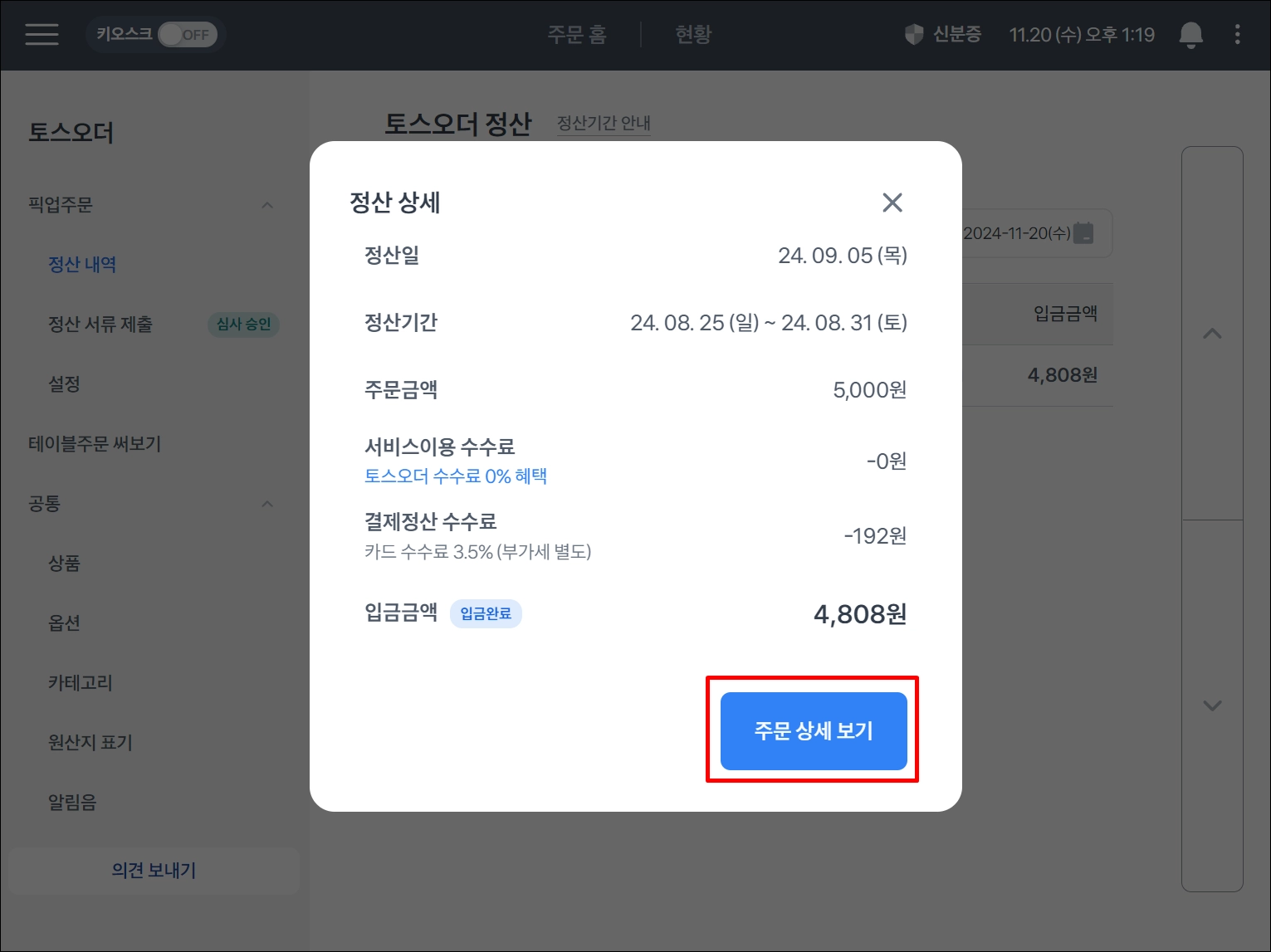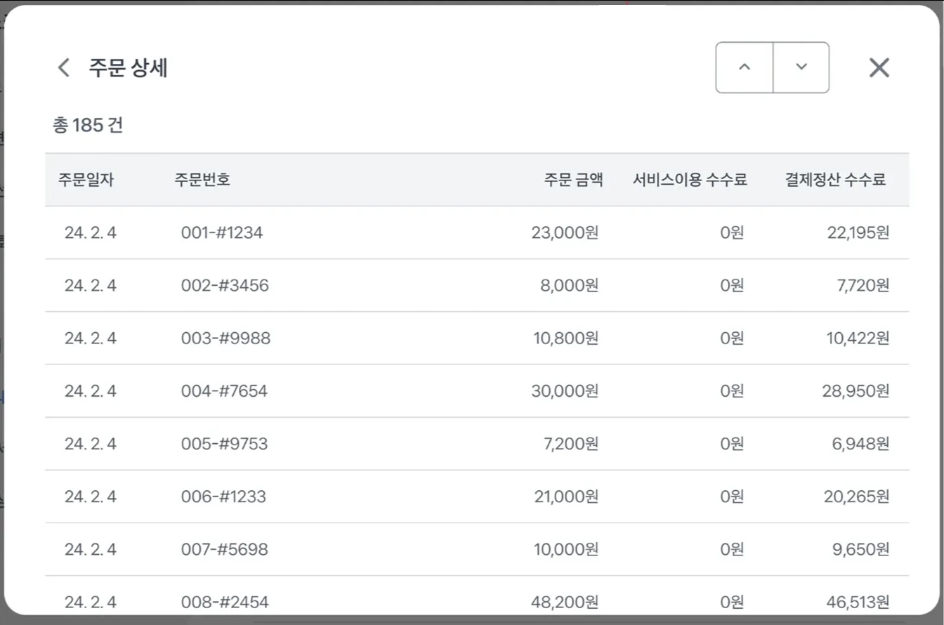 토스오더 정산 내역
